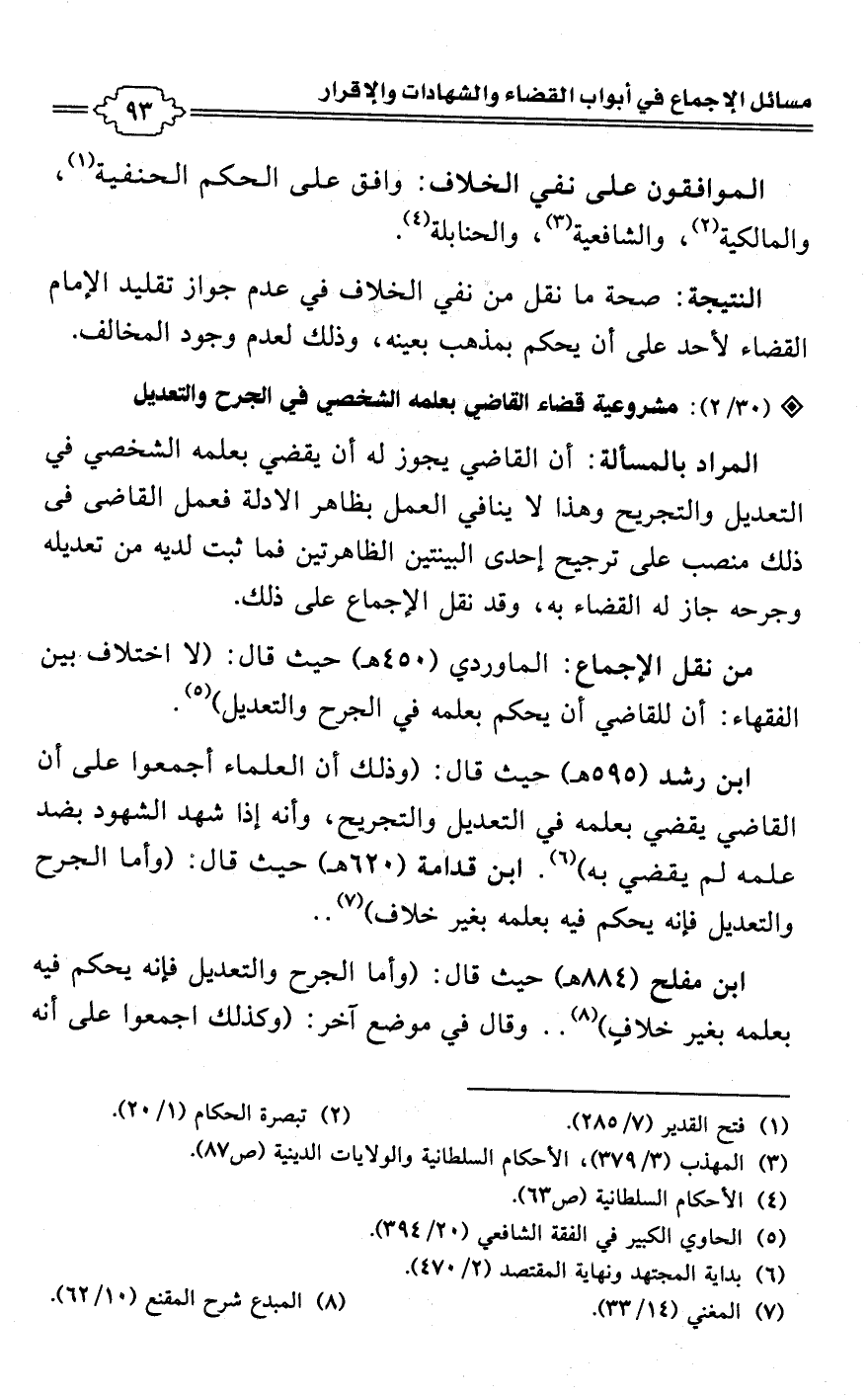 ابن مفلح (884 هـ) حيث قال: (وأما الجرح والتعديل فإنه يحكم فيه بعلمه بغير خلافٍ) (¬8). . وقال في موضع آخر: (وكذلك اجمعوا على أنه
