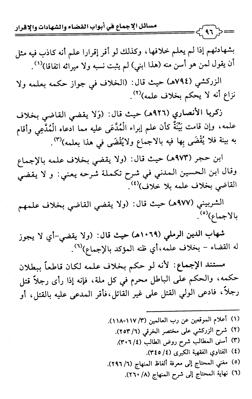 الشربيني (977 هـ) حيث قال: (ولا يقضي القاضي بخلاف علمهم بالإجماع) (¬5).