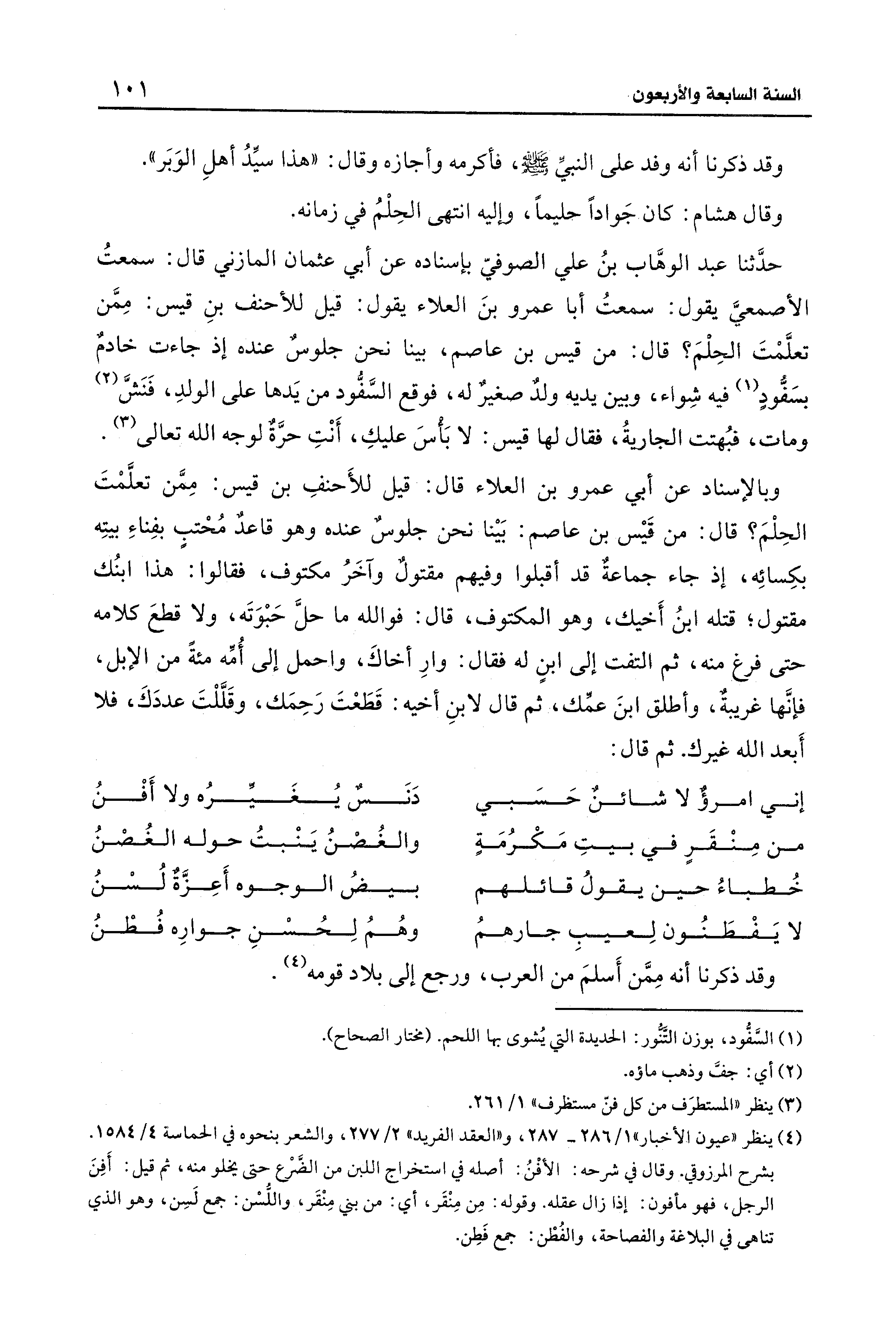 وبالإسناد عن أبي عمرو بن العلاء قال: قيل للأَحنفِ بن قيس: مِمَّن تعلَّمْتَ الحِلْمَ؟ قال: من قَيس بن عاصم: بَينا نحن جلوس عنده وهو قاعد مُحْتبٍ بفِناءِ بيتِه بكِسائِه، إذ جاء جماعةٌ قد أقبلوا وفيهم مقتول وآخَرُ مكتوف، فقالوا: هذا ابنُك مقتول، قتله ابنُ أَخيك، وهو المكتوف، قال: فوالله ما حلَّ حَبْوَتَه، ولا قطعَ كلامه حتى فرغ منه، ثم التفت إلى ابنٍ له فقال: وارِ أخاكَ، واحمل إلى أُمِّه مئةً من الإبل، فإنَّها غريبة، وأطلق ابنَ عمِّك، ثم قال لابنِ أخيه: قَطَعْتَ رَحِمَك، وقَلَّلْتَ عددَكَ، فلا أَبعد الله غيرك. ثم قال:
