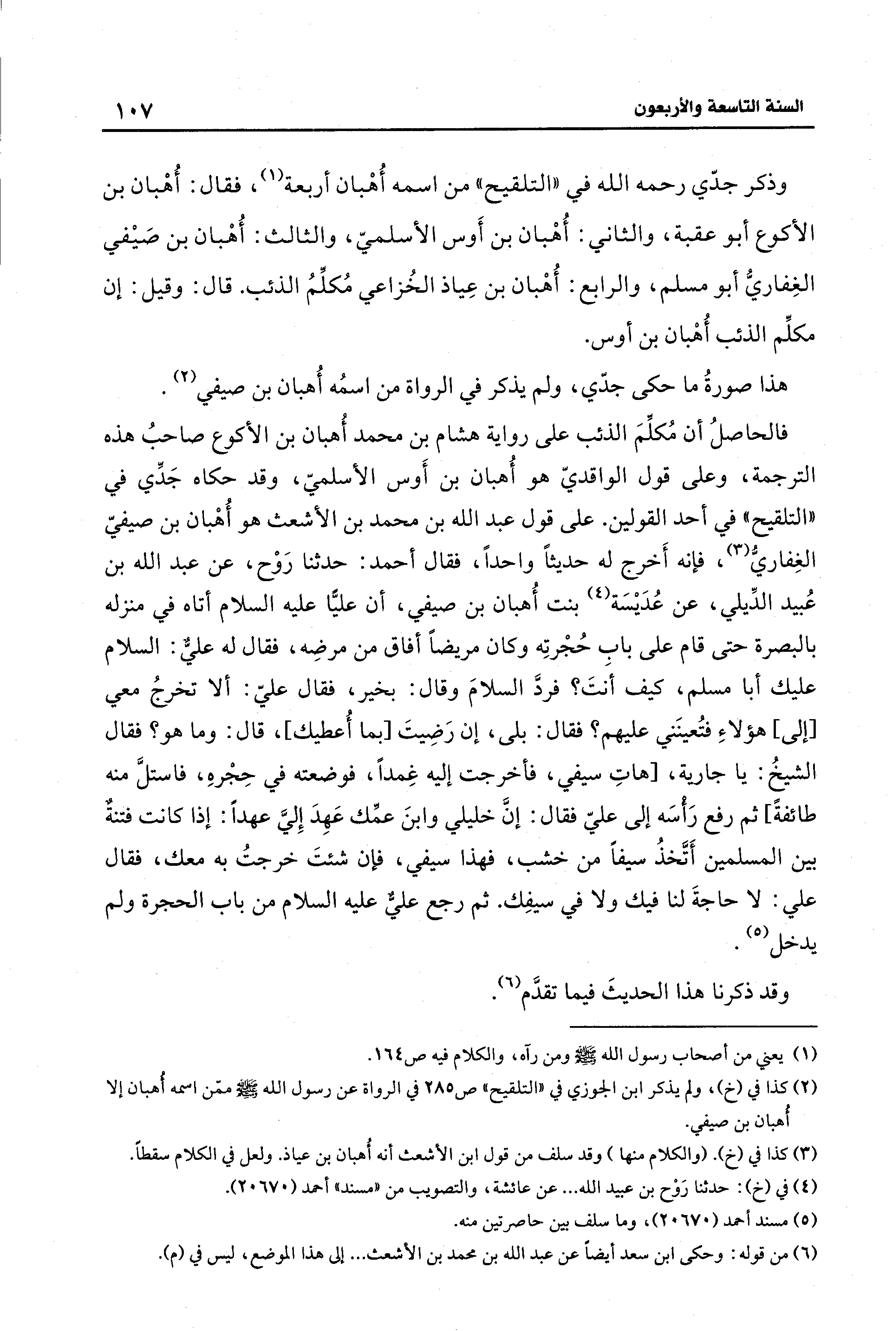 فالحاصلُ أن مُكلِّمَ الذئب على رواية هشام بن محمد أُهبان بن الأكوع صاحبُ هذه الترجمة، وعلى قول الواقديّ هو أُهبان بن أَوس الأسلميّ، وقد حكاه جَدِّي في "التلقيح" في أحد القولين. على قول عبد الله بن محمد بن الأشعث هو أُهْبان بن صيفيّ الغِفاريّ (¬3)، فإنه أَخرج له حديثًا واحدًا، فقال أحمد: حدثنا رَوْح، عن عبد الله بن عُبيد الدِّيلي، عن عُدَيْسَة (¬4) بنت أُهبان بن صيفي، أن عليًّا - عليه السلام - أتاه في منزله بالبصرة حتى قام على باب حُجْرتِه وكان مريضًا أفاق من مرضِه، فقال له عليٌّ: السلام عليك أبا مسلم، كيف أنَتَ؟ فردَّ السلامَ وقال: بخير، فقال عليّ: ألا تخرجُ معي [إلى] هؤلاءِ فتُعينَني عليهم؟ فقال: بلى، إدْ رَضِيتَ [بما أُعطيك]، قال: وما هو؟ فقال الشيخُ: يا جارية، [هاتِ سيفي، فأخرجت إليه غِمدًا، فوضعته في حِجْرهِ، فاستلَّ منه طائفةً] ثم رفع رَأْسَه إلى عليّ فقال: إنَّ خليلي وابنَ عمِّك عَهِدَ إِفيَ عهدًا: إذا كانت فتنةٌ بين المسلمين أَتَّخذُ سيفًا من خشب، فهذا سيفي، فإن شئتَ خرجتُ به معك، فقال علي: لا حاجةَ لنا فيك ولا في سيفِك. ثم رجع عليٌّ - عليه السلام - من باب الحجرة ولم يدخل (¬5).