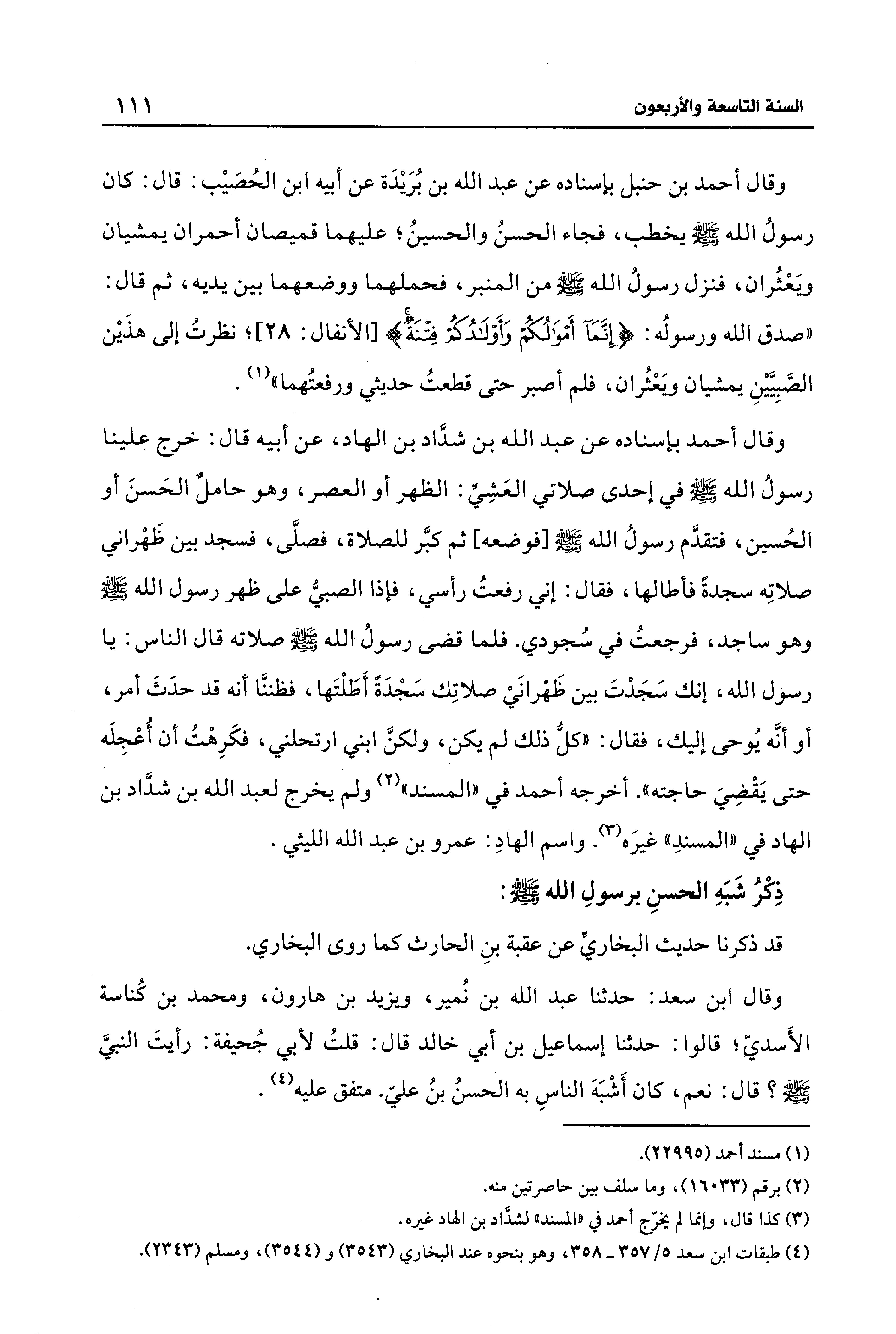 وقال أحمد بإسناده عن عبد الله بن شدَّاد بن الهاد، عن أبيه قال: خرج علينا رسولُ الله صلى الله عليه وسلم في إحدى صلاتي العَشِيّ: الظهر أو العصر، وهو حاملٌ الحَسنَ أو الحُسين، فتقدَّم رسولُ الله صلى الله عليه وسلم [فوضعه] ثم كبَّر للصلاة، فصلَّى، فسجد بين ظَهْراني صلاتِه سجدةَ فأطالها، فقال: إني رفعتُ رأسي، فإذا الصبيُّ على ظهر رسول الله صلى الله عليه وسلم وهو ساجد، فرجعتُ في سُجودي. فلما قضى رسولُ الله صلى الله عليه وسلم صلاته قال الناس: يا رسول الله، إنك سَجَدْتَ بين ظَهْرانَي صلاتِك سَجْدَةً أَطَلْتَها، فظننَّا أنه قد حدَثَ أمر، أو أنَّه يُوحى إليك، فقال: "كلُّ ذلك لم يكن، ولكنَّ ابني ارتحلني، فكَرِهْتُ أن أُعْجِلَه حتى يَقْضِيَ حاجته". أخرجه أحمد في "المسند" (¬2) ولم يخرج لعبد الله بن شدَّاد بن الهاد في "المسندِ" غيرَه (¬3). واسم الهادِ: عمرو بن عبد الله الليثي.