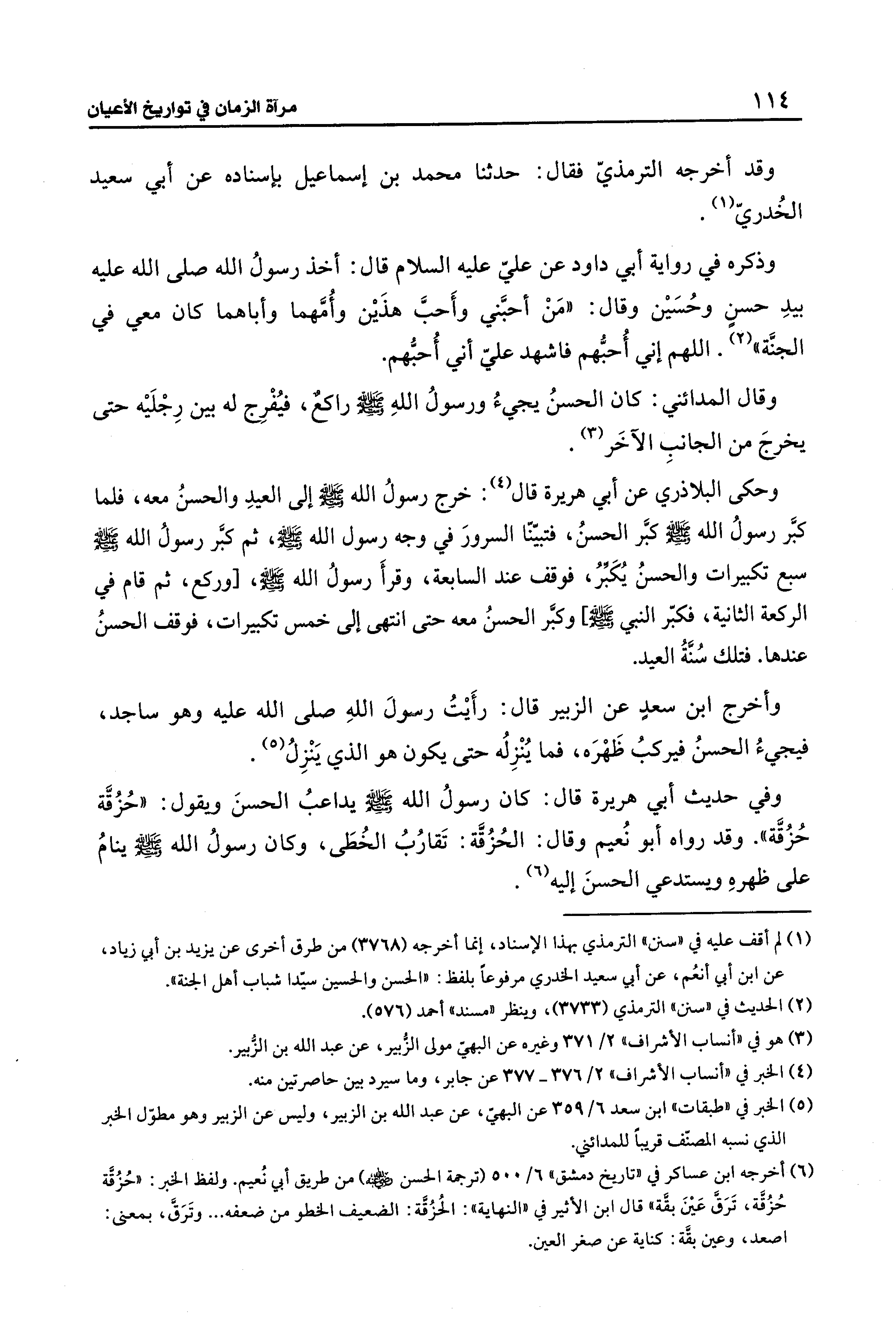 وحكى البلاذري عن أبي هريرة قال (¬4): خرج رسولُ الله صلى الله عليه وسلم إلى العيدِ والحسنُ معه، فلما كبَّر رسولُ الله صلى الله عليه وسلم كبَّر الحسنُ، فتبيَّنا السرورَ في وجه رسول الله صلى الله عليه وسلم، ثم كبَّر رسولُ الله صلى الله عليه وسلم سبع تكبيرات والحسنُ يُكَبِّرُ، فوقف عند السابعة، وقرأَ رسولُ الله - صلى الله عليه وسلم -، [وركع، ثم قام في الركعة الثانية، فكبَّر النبي - صلى الله عليه وسلم -] وكبَّر الحسنُ معه حتى انتهى إلى خمس تكبيرات، فوقف الحسنُ عندها. فتلك سُنةُ العيد.
