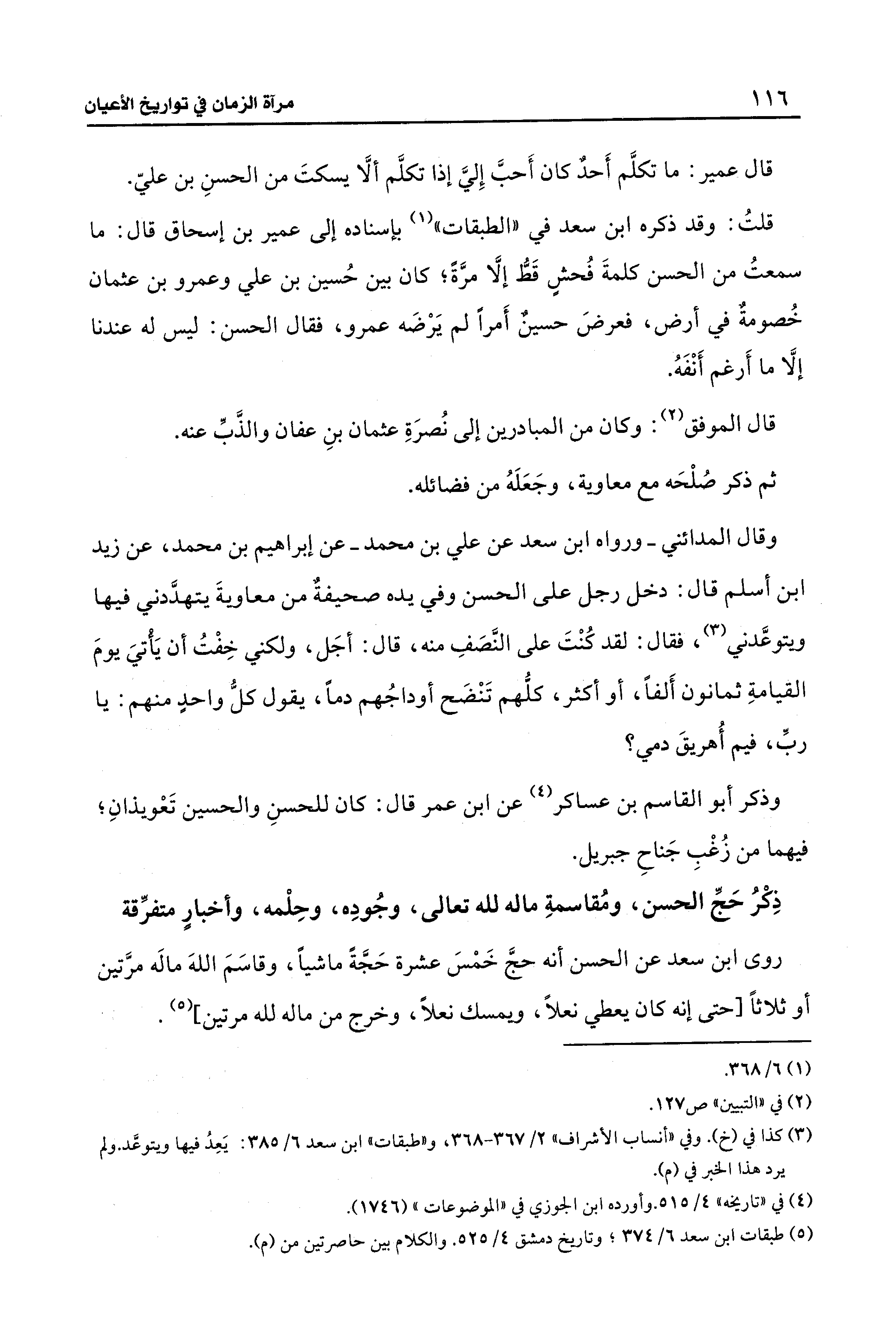 وقال المدائني -ورواه ابن سعد عن علي بن محمد- عن إبراهيم بن محمد، عن زيد بن أسلم قال: دخل رجل على الحسن وفي يده صحيفةٌ من معاويةَ يتهدَّدني فيها ويتوعَّدني (¬3)، فقال: لقد كُنْتَ على النَّصَفِ منه، قال: أجَل، ولكني خِفْتُ أن يأتيَ يومَ القيامةِ ثمانون أَلفًا، أو أكثر، كلُّهم تَنْضَح أوداجُهم دمًا، يقول كلُّ واحدٍ منهم: يا ربِّ، فيم أُهريقَ دمي؟