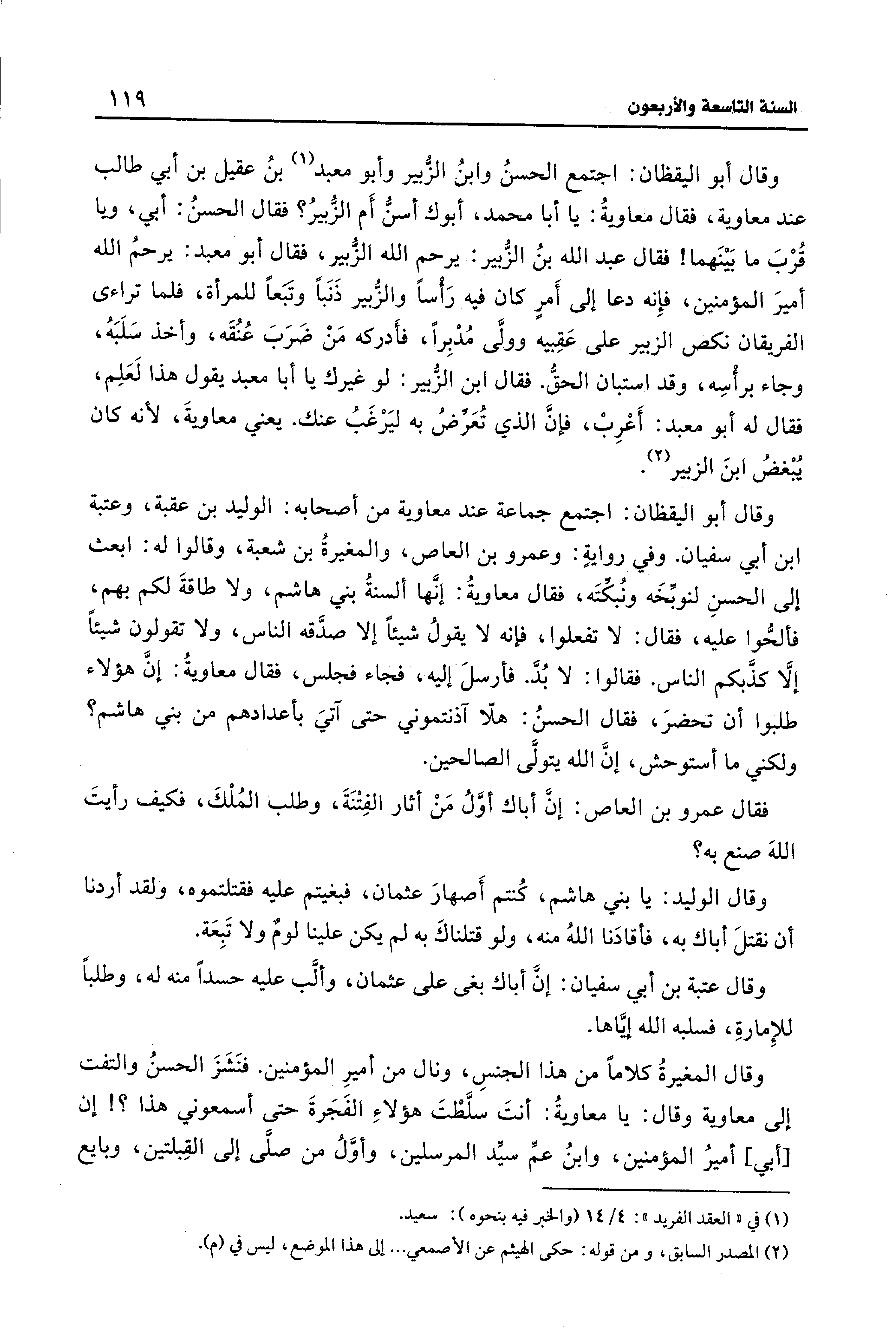 وقال المغيرةُ كلامًا من هذا الجنسِ، ونال من أميرِ المؤمنين. فنَشَزَ الحسنُ والتفت إلى معاوية وقال: يا معاويةُ: أنتَ سلَّطْتَ هؤلاءِ الفَجَرةَ حتى أسمعوني هذا؟ ! إن [أبي] أميرُ المؤمنين، وابنُ عمِّ سيِّد الموسلين، وأوَّلُ من صلَّى إلى القِبلتين، وبايع