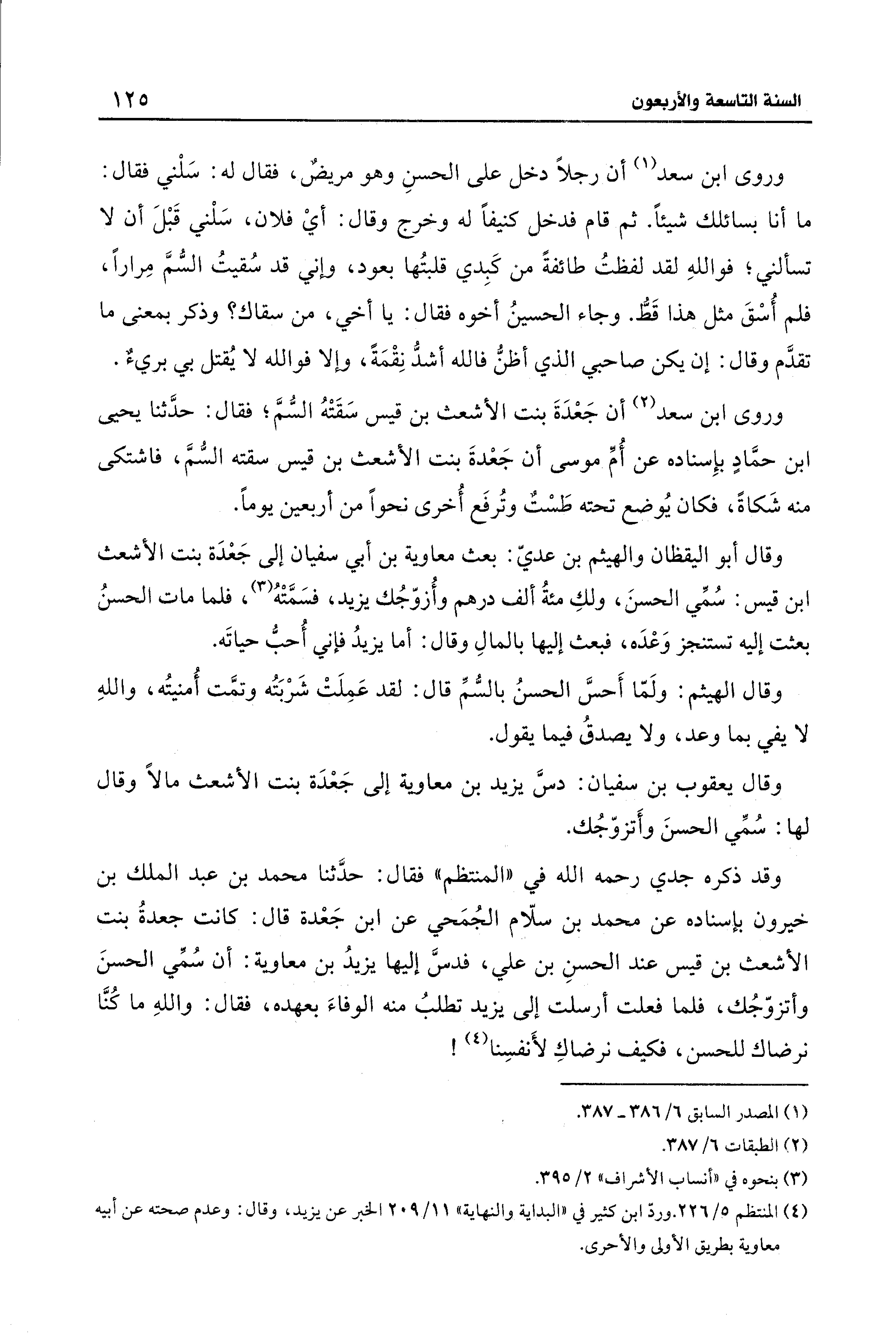 وقد ذكره جدي رحمه الله في "المنتظم" فقال: حدَّثنا محمد بن عبد الملك بن خيرون بإسناده عن محمد بن سلّام الجُمَحي عن ابن جَعْدة قال: كانت جعدةُ بنت الأشعث بن قيس عند الحسنِ بن علي، فدسَّ إليها يزيدُ بن معاوية: أن سُمِّي الحسنَ وأتزوّجُك، فلما فعلت أرسلت إلى يزيد تطلبُ منه الوفاءَ بعهده، فقال: واللهِ ما كُنَّا نرضاك للحسن، فكيف نرضاكِ لأَنفسِنا (¬4)!