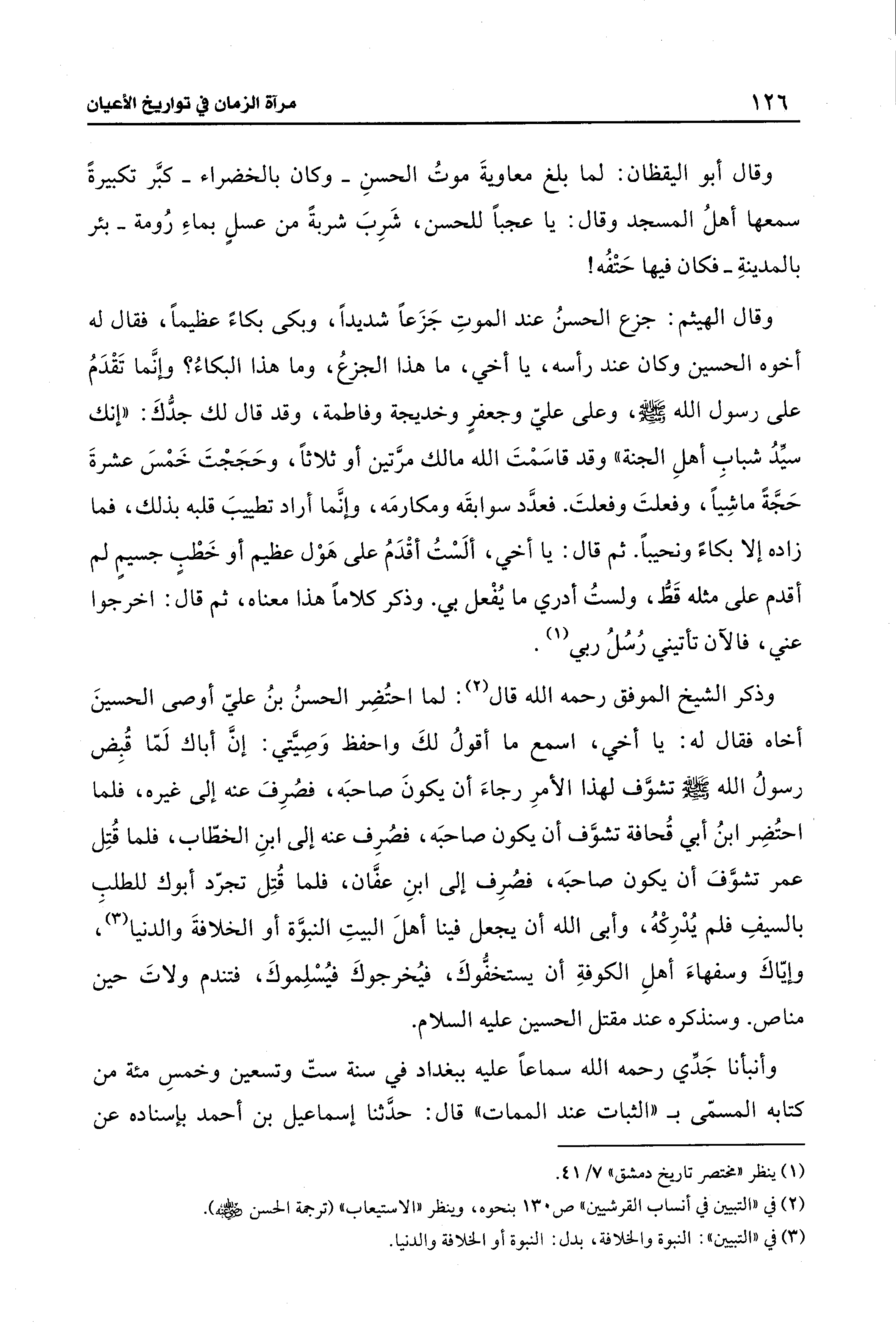 وقال أبو اليقظان: لما بلغ معاويةَ موتُ الحسنِ -وكان بالخضراء- كبَّر تكبيرةً سمعها أهلُ المسجد وقال: يا عجبًا للحسن، شَرِبَ شربةً من عسلٍ بماءِ رُومة -بئر بالمدينةِ- فكان فيها حَتْفُه!