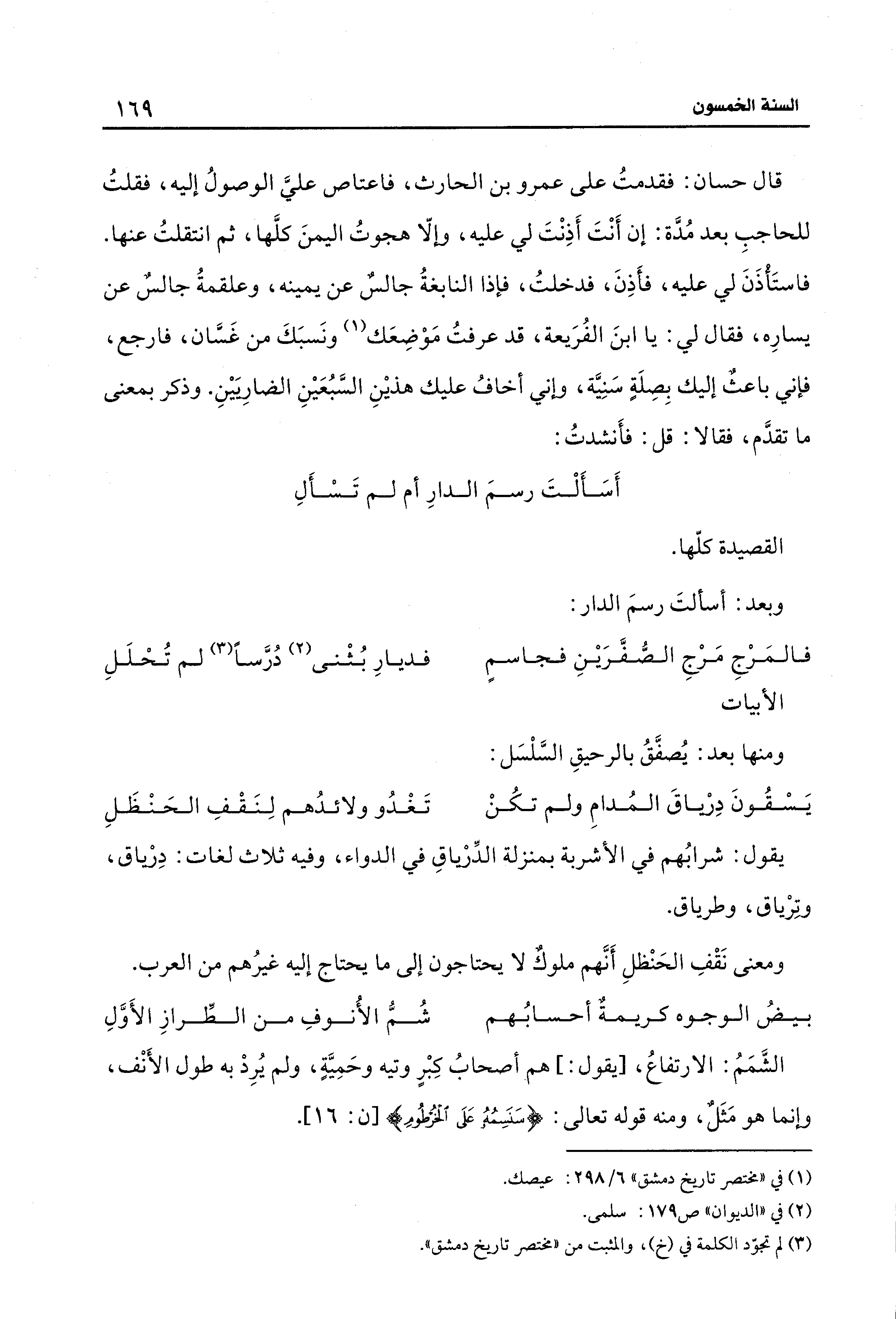 قال حسان: فقدمتُ على عمرو بن الحارث، فاعتاص عليّ الوصولُ إليه، فقلتُ للحاجبِ بعد مُدَّة: إن أَنْتَ أَذِنْت لي عليه، وإلّا هجوتُ اليمنَ كلَّها، ثم انتقلتُ عنها. فاستَأْذَنَ لي عليه، فأَذِنَ، فدخلتُ، فإذا النابغةُ جالسٌ عن يمينه، وعلقمةُ جالسٌ عن يسارِه، فقال لي: يا ابنَ الفُرَيعة، قد عرفتُ مَوْضِعَك (¬1) ونَسبَكَ من غَسَّان، فارجع، فإني باعث إليك بِصِلَةٍ سَنِيَّة، وإني أخافُ عليك هذينِ السَّبُعَينِ الضارِيَينِ. وذكر بمعنى ما تقدَّم، فقالا: قل: فأَنشدتُ: