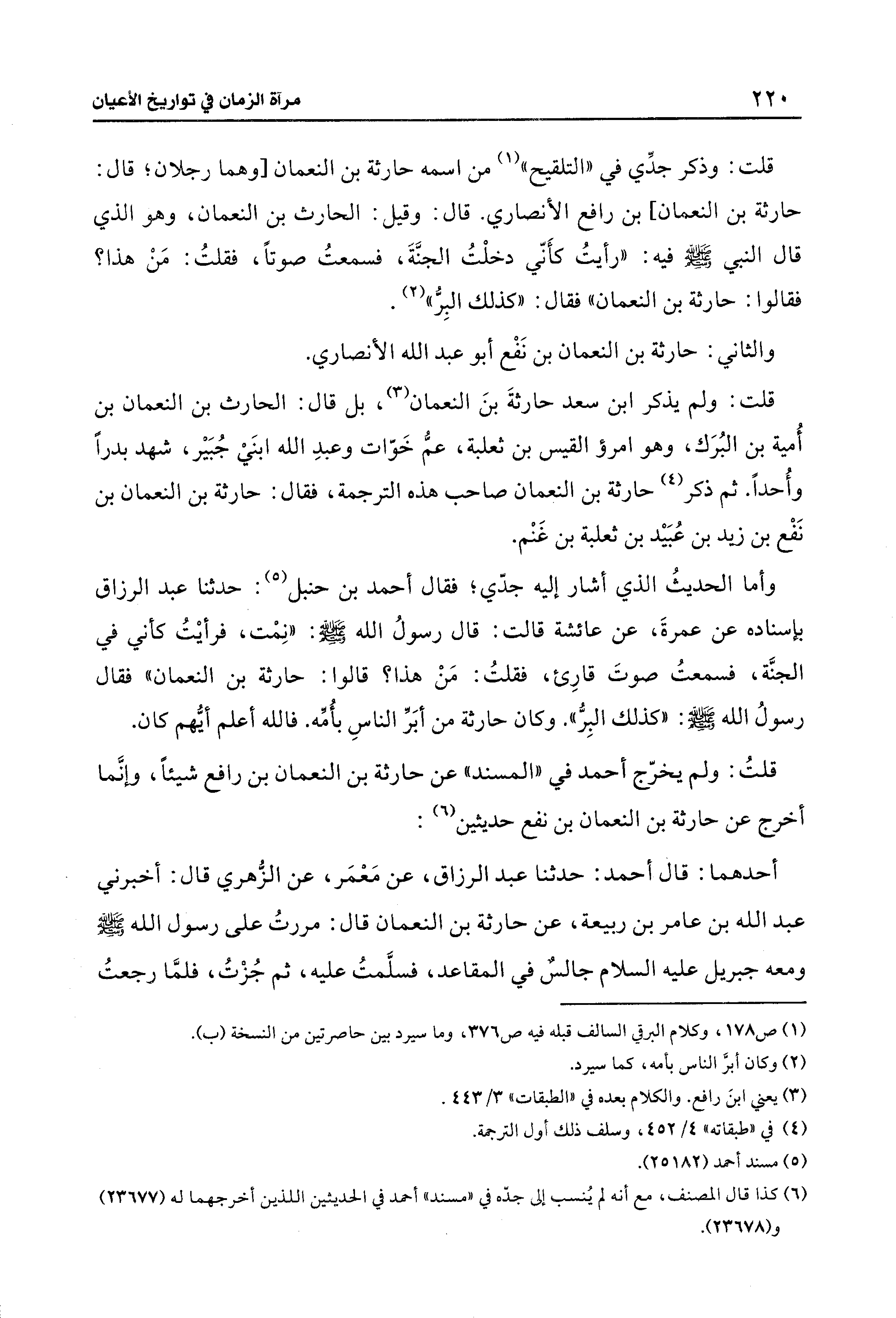 أحدهما: قال أحمد: حدثنا عبد الرزاق، عن مَعمَر، عن الزّهري قال: أخبرني عبد الله بن عامر بن ربيعة، عن حارثة بن النعمان قال: مررتُ على رسول الله - صلى الله عليه وسلم - ومعه جبريل - عليه السلام - جالسٌ في المقاعد، فسلَّمتُ عليه، ثم جُزْتُ، فلمَّا رجعتُ