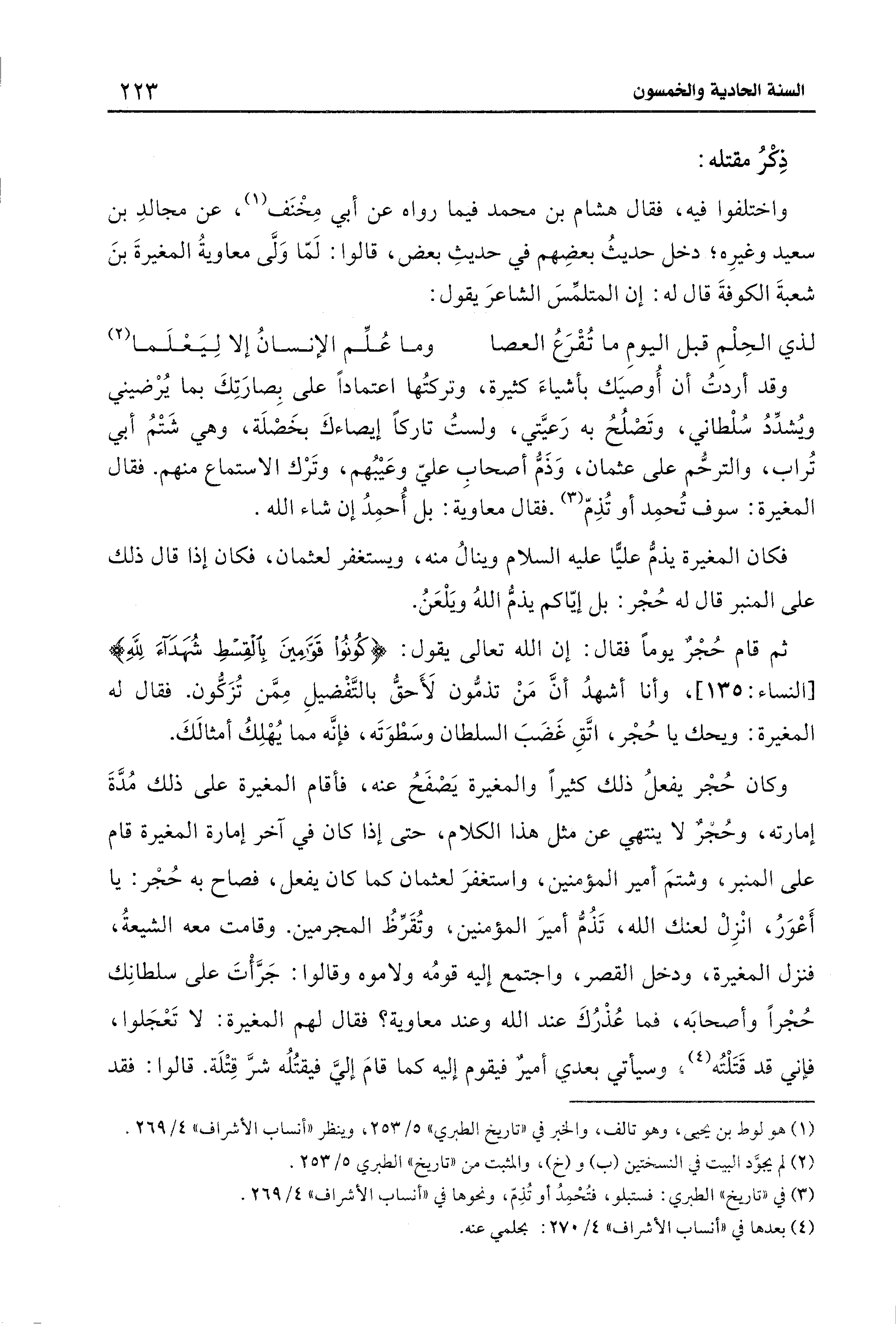 فكان المغيرة يذمُّ عليًّا - عليه السلام - وينال منه، ويستغفر لعثمان، فكان إذا قال ذنك على المنبر قال له حُجْر: بل إيّاكم يذمُّ اللهُ ويلْعَنُ.
