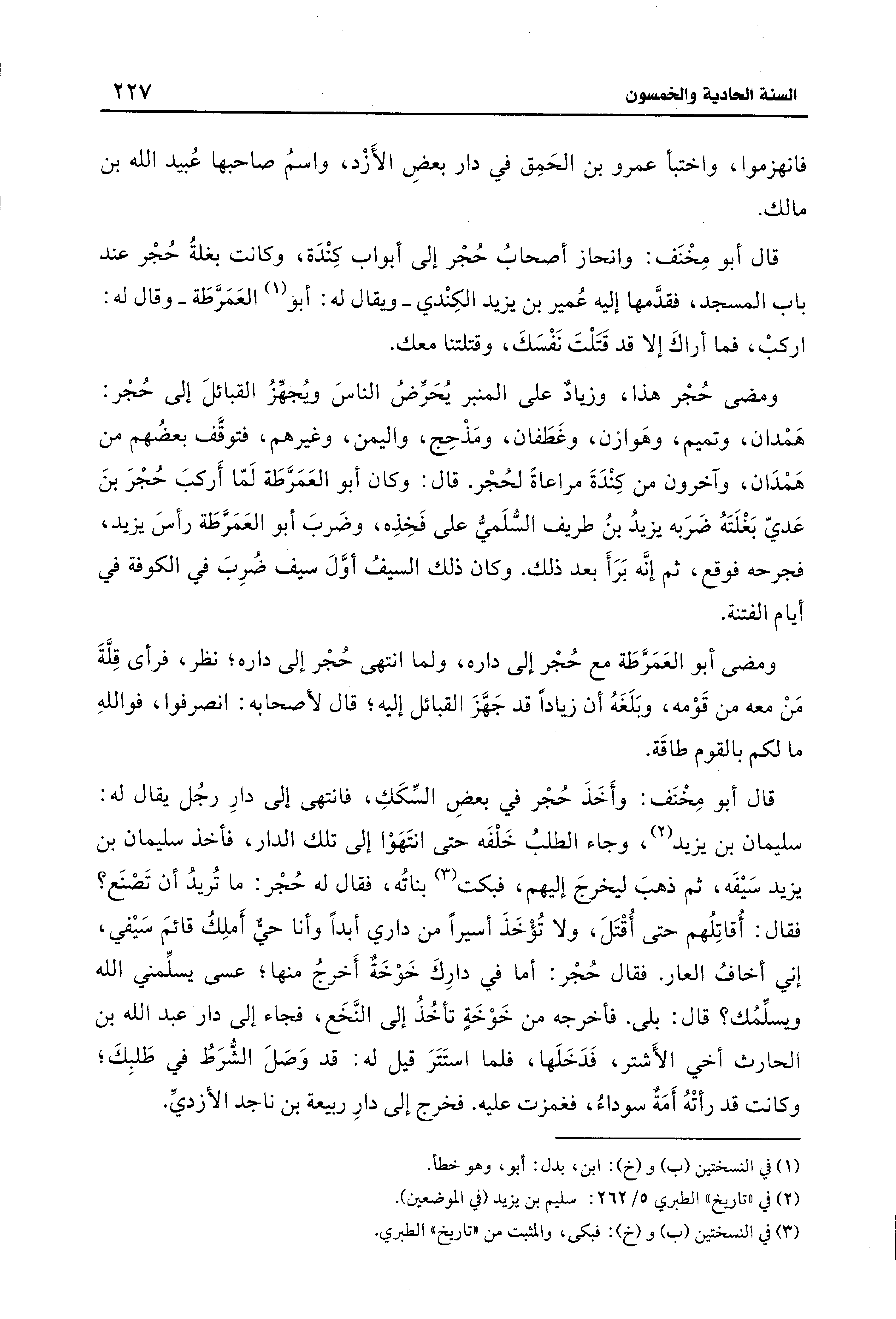 ومضى حُجْر هذا، وزيادٌ على المنبر يُحَرِّضُ الناسَ ويُجهِّزُ القبائلَ إلى حُجْر: همدان، وتميم، وهوزن، وغَطَفان، ومَذْحِج، واليمن، وغيرهم، فتوقَّف بعضُهم من همدَان، وآخرون من كِنْدَةَ مراعاةً لحُجْر. قال: وكان أبو العَمَرَّطَة لَمّا أَركبَ حُجْرَ بنَ عَديّ بَغْلَتَهُ ضَرَبه يزيدُ بنُ طريف السُّلَميُّ على فَخِذِه، وضَربَ أبو العَمَرَّطَة رأسَ يزيد، فجرحه فوقع، ثم إنَّه بَرَأَ بعد ذلك. وكان ذلك السيفُ أوَّلَ سيف ضُرِبَ في الكوفة في أيام الفتنة.