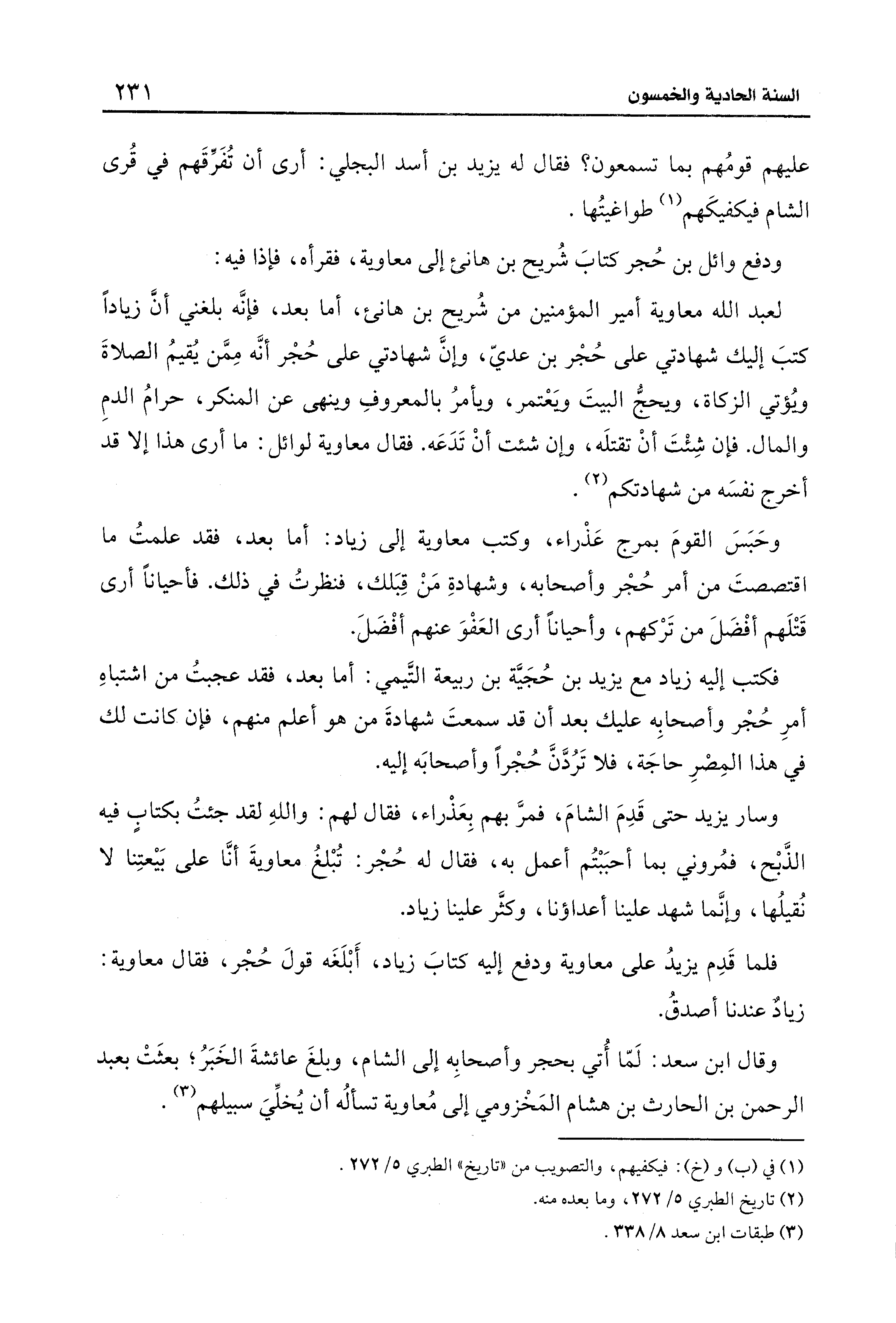 فكتب إليه زياد مع يزيد بن حُجَيَّة بن ربيعة التَّيمي: أما بعد، فقد عجبتُ من اشتباهِ أمرِ حُجْر وأصحابِه عليك بعد أن قد سمعتَ شهادةَ من هو أعلم منهم، فإن كانت لك في هذا المِصرِ حاجَة، فلا تَرُدَّنَّ حُجْرًا وأصحابَه إليه.