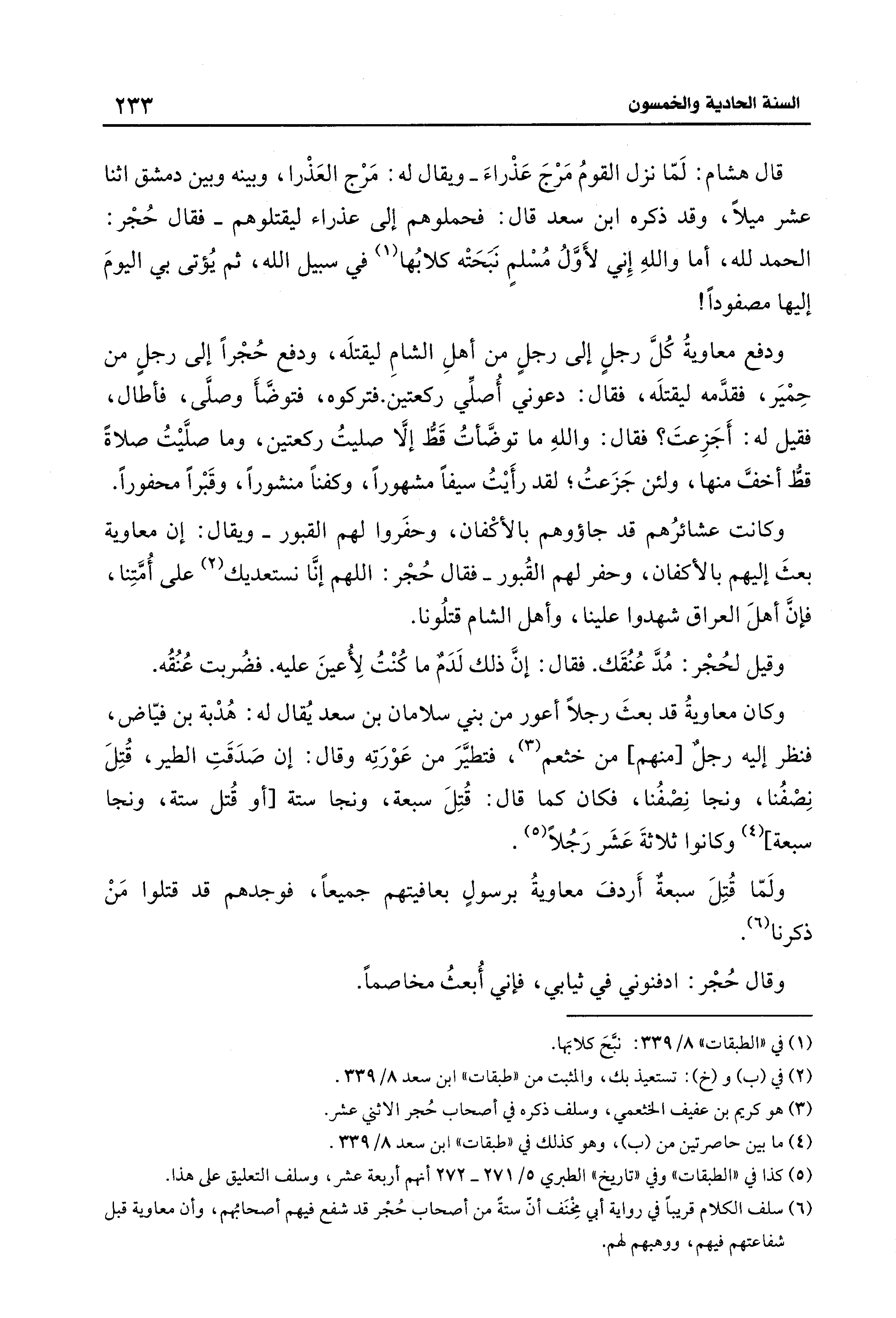 (¬6) سلف الكلام قريبًا في رواية أبي مِخْنَف أن ستةً من أصحاب حُجْر قد شفع فيهم أصحابُهم، وأن معاوية قبل شفاعتهم فيهم، ووهبهم لهم.