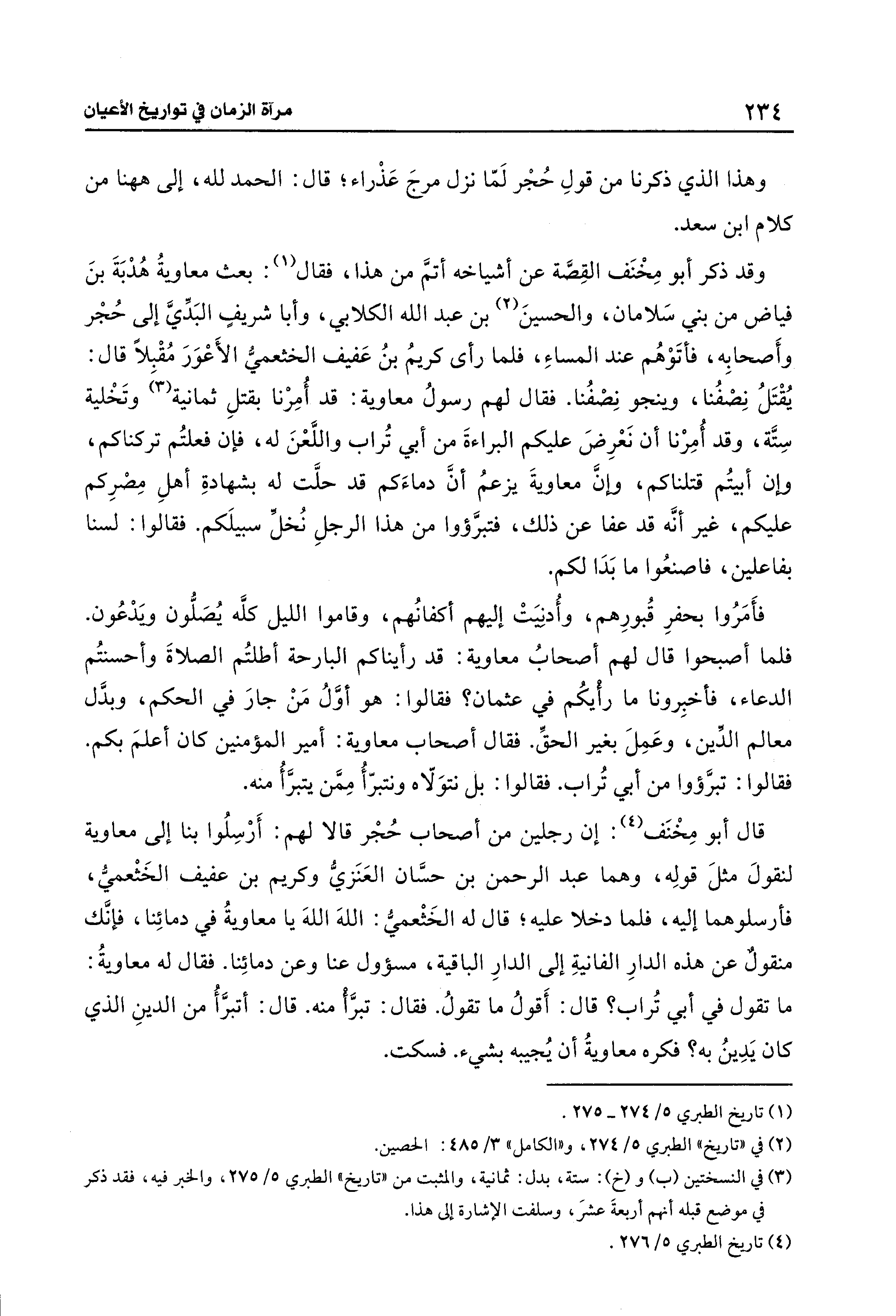 وقد ذكر أبو مِخْنَف القِصَّة عن أشياخه أتمَّ من هذا، فقال (¬1): بعث معاويةُ هدبَةَ بنَ فياض من بني سَلامان، والحسينَ (¬2) بن عبد الله الكلابي، وأبا شريفٍ البَدِّيَّ إلى حُجْر وأَصحابِه، فأتَوْهُم عند المساءِ، فلما رأى كريمُ بنُ عَفيف الخثعميُّ الأَعوَرَ مُقْبلًا قال: يُقْتَلُ نصفُنا، وينجو نِصْفُنا. فقالمالهم رسولُ معاوية: قد أُمِرنا بقتلِ ثمانية (¬3) وتَخْلية سِتَّة، وقد أُمِرنا أن نَعْرِضَ عليكم البراءةَ من أبي تُراب واللَّعنَ له، فإن فعلتُم تركناكم، وإن أبيتُم قتلناكم، وإنَّ معاويةَ يزعمُ أنَّ دماءَكم قد حلَّت له بشهادةِ أهلِ مصرِكم عليكم، غير أنَّه قد عفا عن ذلك، فتبرَّؤوا من هذا الرجلِ نُخلِّ سبيلَكم. فقالوا: لسنا بفاعلين، فاصنعُوا ما بَدَا لكم.