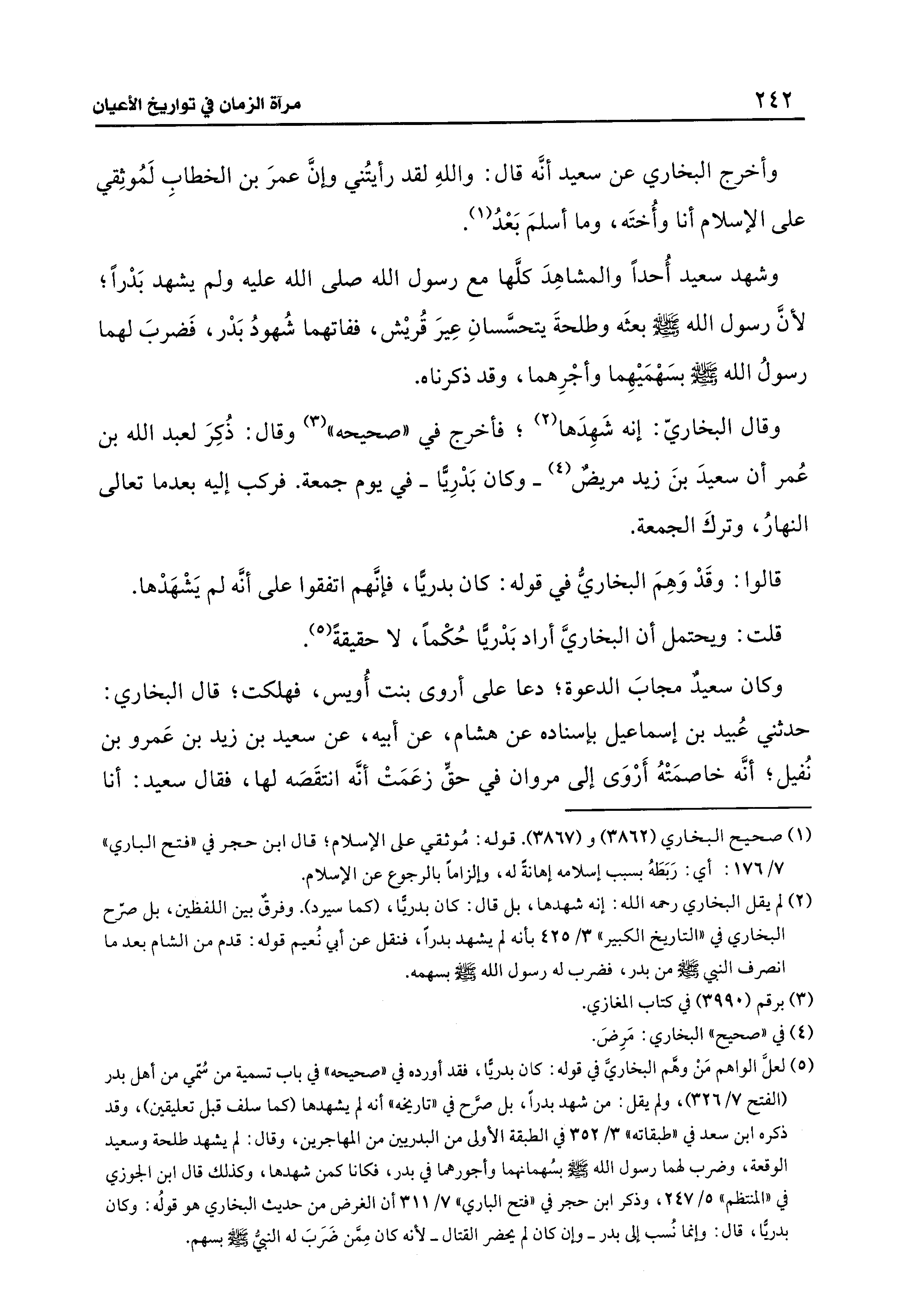 (¬5) لعلَّ الواهم مَنْ وهَّم البخاريَّ في قوله: كان بدريًّا، فقد أورده في "صحيحه" في باب تسمية من سمي من أهل بدر (الفتح 7/ 326)، ولم يقل: من شهد بدرًا، بل صرَّح في "تاريخه" أنه لم يشهدها (كما سلف قبل تعليقين)، وقد ذكره ابن سعد في "طبقاته" 3/ 352 في الطبقة الأولى من البدريين من الهاجرين، وقال: لم يشهد طلحة وسعيد الوقعة، وضرب لهما رسول الله - صلى الله عليه وسلم - بسُهمانهما وأجورهما في بدر، فكانا كمن شهدها، وكذلك قال ابن الجوزي في "المنتظم" 5/ 247، وذكر ابن حجر في "فتح الباري" 7/ 311 أن الغرض من حديث البخاري هو قولُه: وكان بدريًّا، قال: وإنما نُسب إلى بدر -وإن كان لم يحضر القتال- لأنه كان مِمَن ضَرَبَ له النبي - صلى الله عليه وسلم - بسهم.