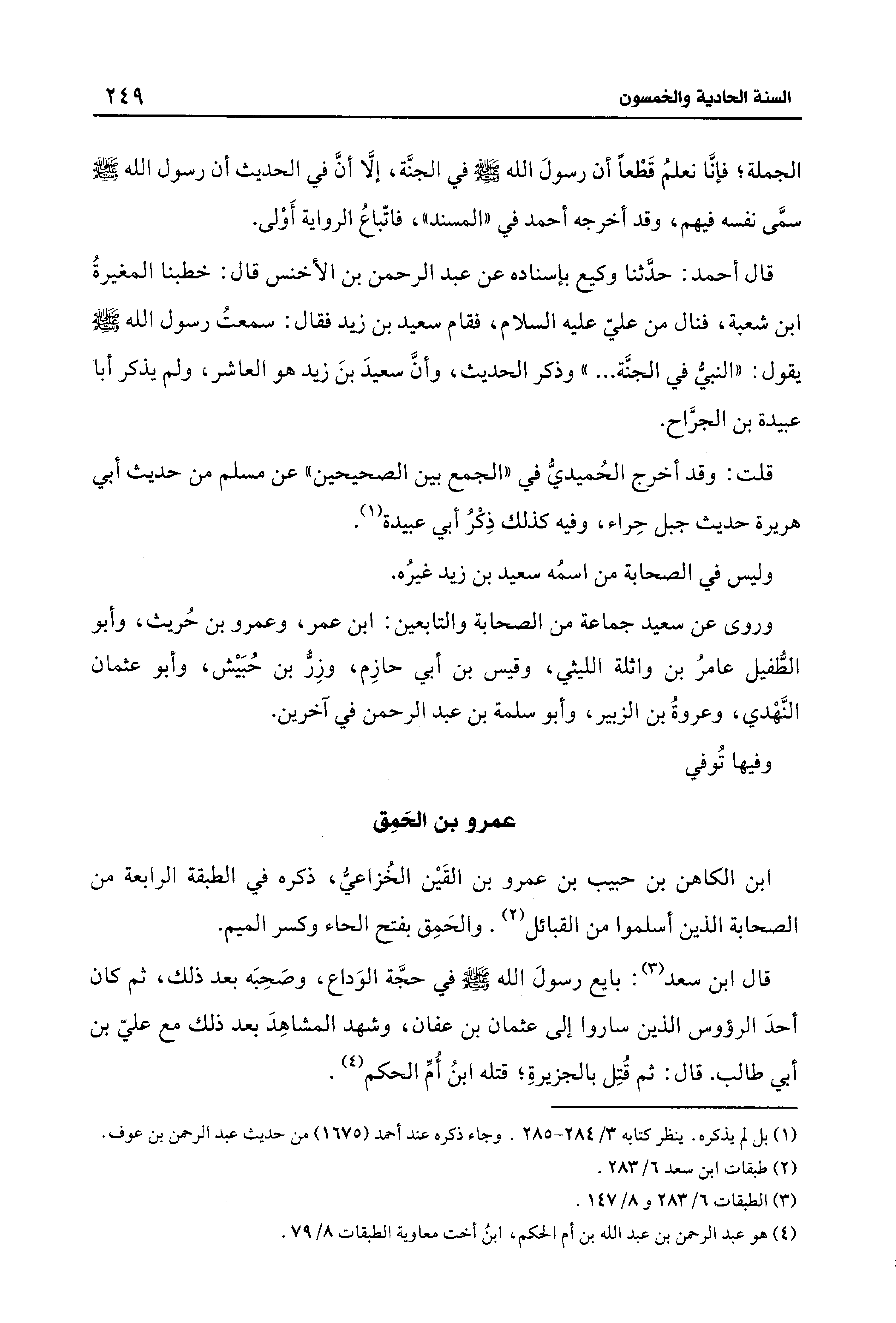 قال أحمد: حدَّثنا وكيع بإسناده عن عبد الرحمن بن الأخنس قال: خطبنا المغيرةُ بن شعبة، فنال من عليّ - عليه السلام -، فقام سعيد بن زيد فقال: سمعتُ رسول الله - صلى الله عليه وسلم - يقول: "النبيّ في الجنَّة ... " وذكر الحديث، وأنَّ سعيدَ بنَ زيد هو العاشر، ولم يذكر أبا عبيدة بن الجرَّاح.