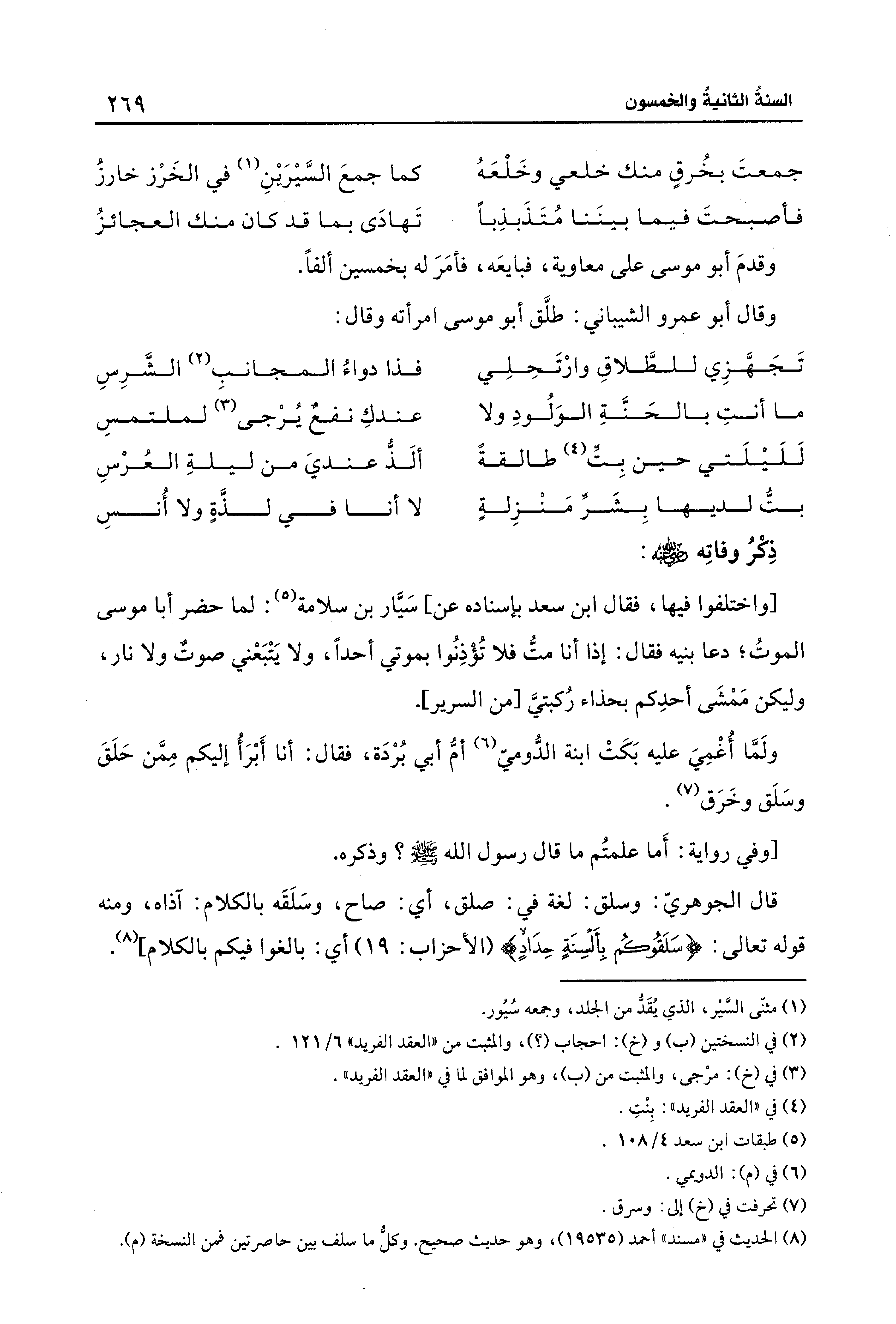 [واختلفوا فيها، فقال ابن سعد بإسناده عن] سَيَّار بن سلامة (¬5): لما حضر أبا موسى الموتُ؛ دعا بنيه فقال: إذا أنا متُّ فلا تُؤذِنُوا بموتي أحدًا، ولا يَتْبَعني صوتٌ ولا نار، وليكن ممشَى أحدِكم بحذاء رُكبتيَّ [من السرير].