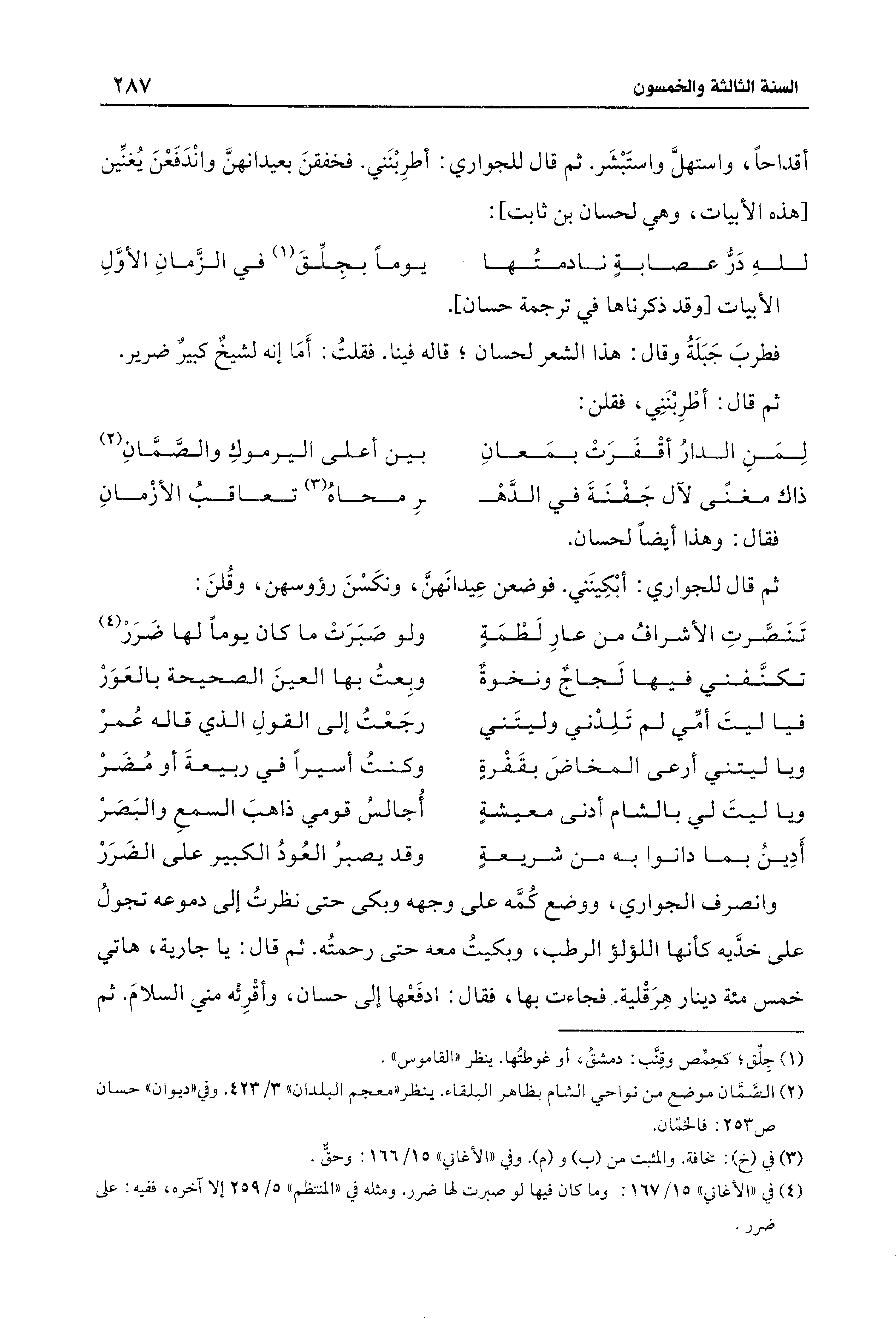 وانصرف الجواري، ووضع كُمَّه على وجهه وبكى حتى نظرتُ إلى دموعه تجولُ على خدَّيه كأنها اللؤلؤ الرطب، وبكيتُ معه حتى رحمتُه. ثم قال: يا جارية، هاتي خمس مئة دينار هِرَقْلية. فجاءت بها، فقال: ادفَعها إلى حسان، وأَقْرِئْه مني السلامَ. ثم
