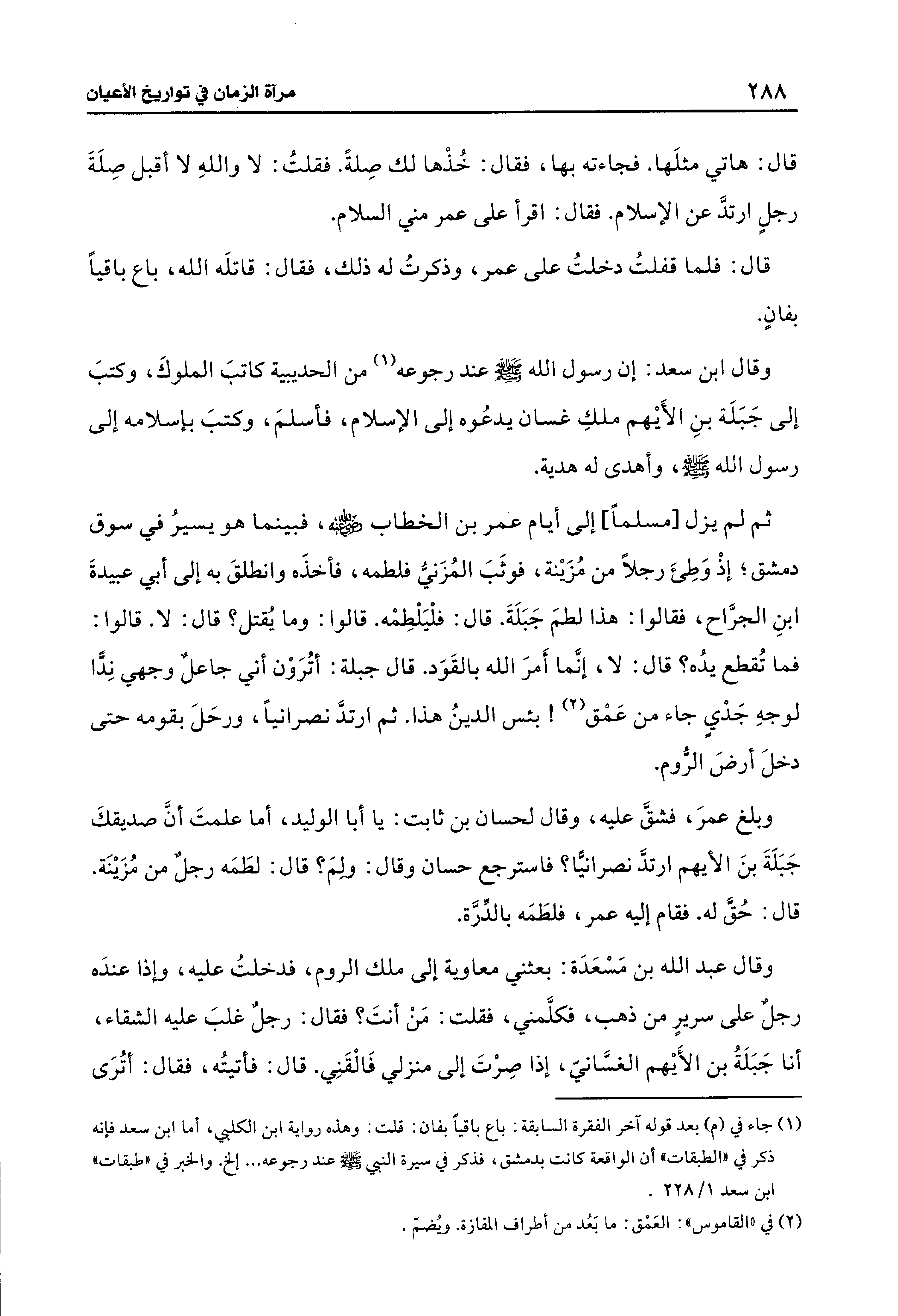 ثم لم يزل [مسلمًا] إلى أيام عمر بن الخطاب - رضي الله عنه -، فبينما هو يسيرُ في سوق دمشق؛ إذْ وَطِئَ رجلًا من مُزَينة، فوثَبَ المُزَنيُّ فلطمه، فأخذَه وانطلقَ به إلى أبي عبيدةَ بنِ الجرَّاح، فقالوا: هذا لطمَ جَبَلَةَ. قال: فلْيَلْطمه. قالوا: وما يُقتل؟ قال: لا. قالوا: فما تُقطع يدُه؟ قال: لا، إنَّما أَمرَ الله بالقَوَد. قال جبلة: أتُرَوْن أني جاعلٌ وجهي نِدًّا لوجهِ جَدْيٍ جاء من عَمْق (¬2)! بئس الدينُ هذا. ثم ارتدَّ نصرانيًّا، ورحَلَ بقومه حتى دخلَ أرضَ الروم.