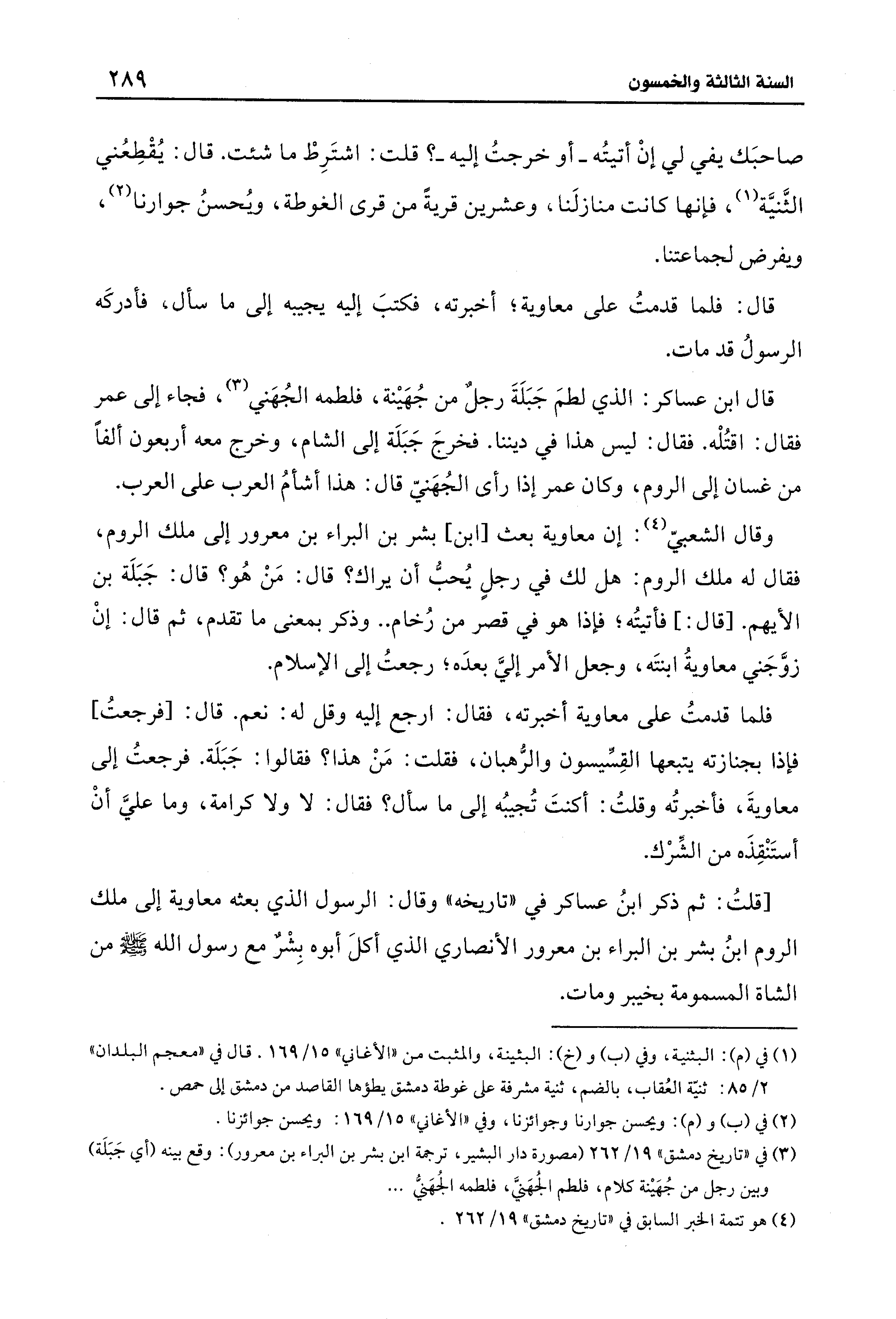 (¬3) في "تاريخ دمشق" 19/ 262 (مصورة دار البشير، ترجمة ابن بشر بن البراء بن معرور): وقع بينه (أي جَبَلَة) وبيت رجل من جُهينة كلام، فلطم الجُهنيَّ، فلطمه الجُهنيُّ ...