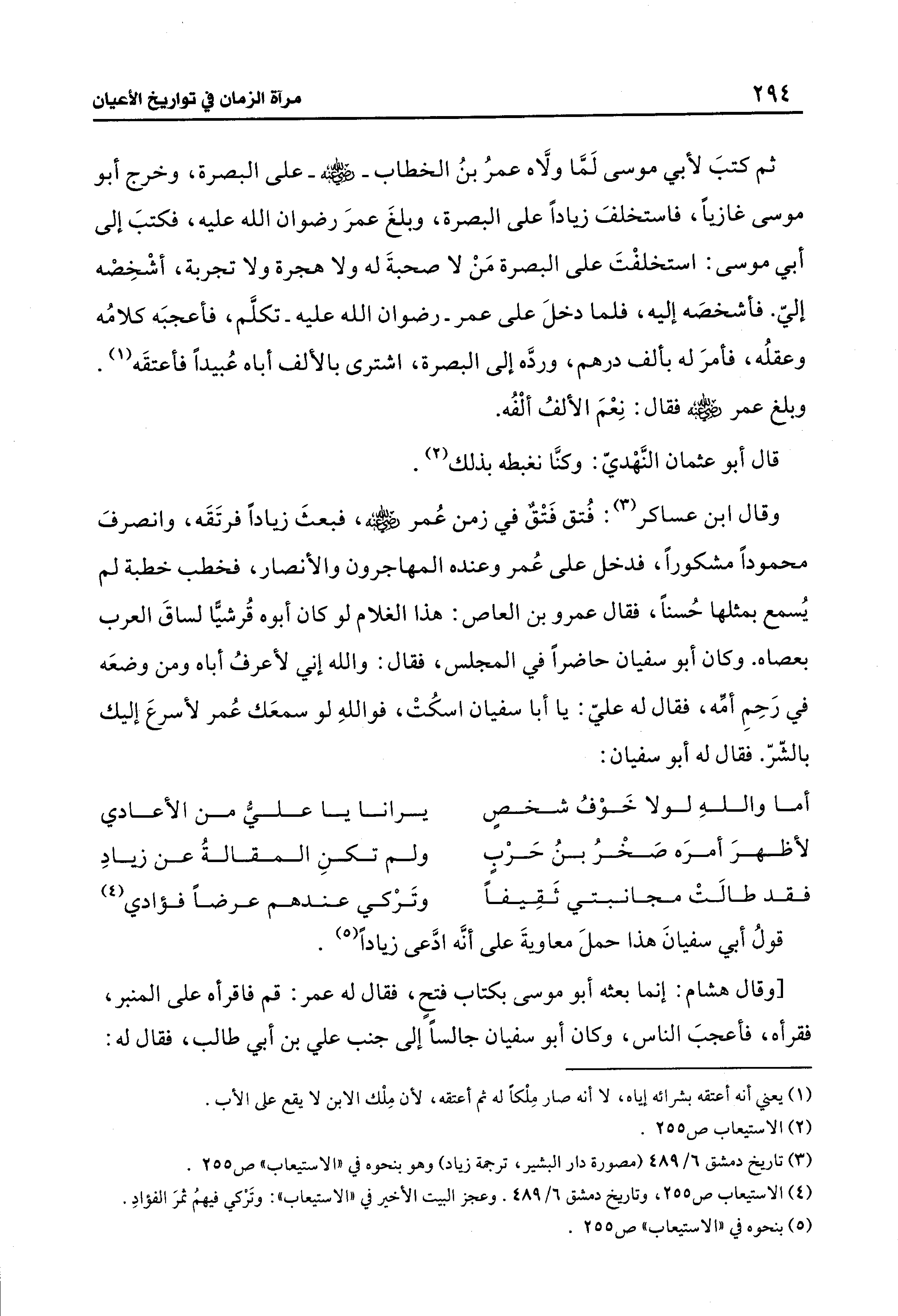ثم كتبَ لأبي موسى لَمَّا ولَّاه عمرُ بنُ الخطاب - رضي الله عنه - على البصرة، وخرج أبو موسى غازيًا، فاستخلفَ زيادًا على البصرة، وبلغَ عمرَ رضوان الله عليه، فكتبَ إلى أبي موسى: استخلفْتَ على البصرة مَنْ لا صحبةَ له ولا هجرة ولا تجربة، أشْخِصه إليّ. فأشخصَه إليه، فلما دخلَ على عمر -رضوان الله عليه- تكلَّم، فأعجبَه كلامُه وعقلُه، فأمرَ له بألف درهم، وردَّه إلى البصرة، اشترى بالألف أباه عُبيدًا فأعتقَه (¬1).