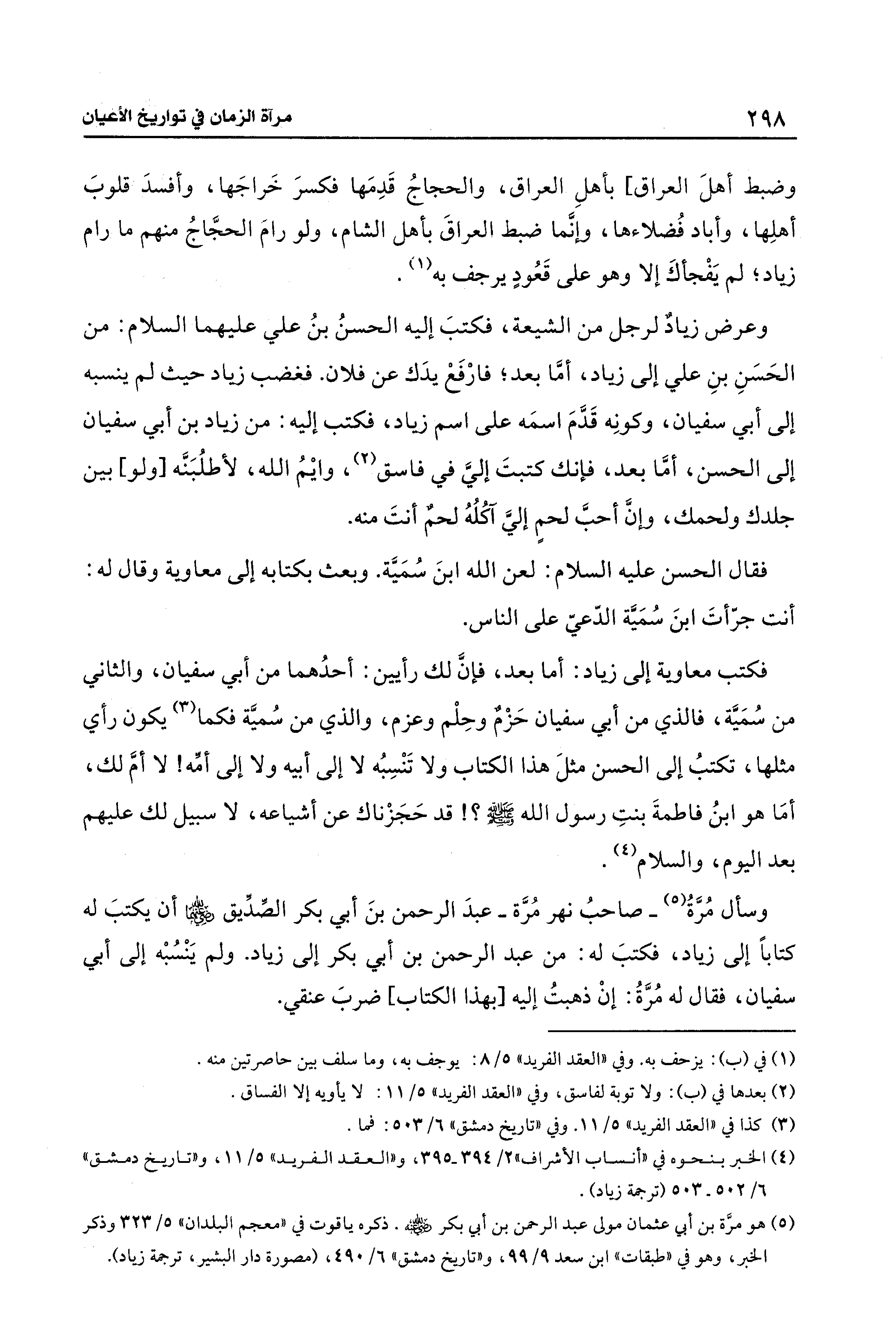 فكتب معاوية إلى زياد: أما بعد، فإنَّ لك رأيين: أحدُهما من أبي سفيان، والثاني من سُمَيَّة، فالذي من أبي سفيان حَزْمٌ وحِلْم وعزم، والذي من سُميَّة فكما (¬3) يكون رأي مثلها، تكتبُ إلى الحسن مثلَ هذا الكتاب ولا تَنْسِبُه لا إلى أبيه ولا إلى أمِّه! لا أمَّ لك، أمَّا هو ابنُ فاطمةَ بنتِ رسول الله - صلى الله عليه وسلم -؟ ! قد حَجَزْناك عن أشياعه، لا سبيل لك عليهم بعد اليوم، والسلام (¬4).