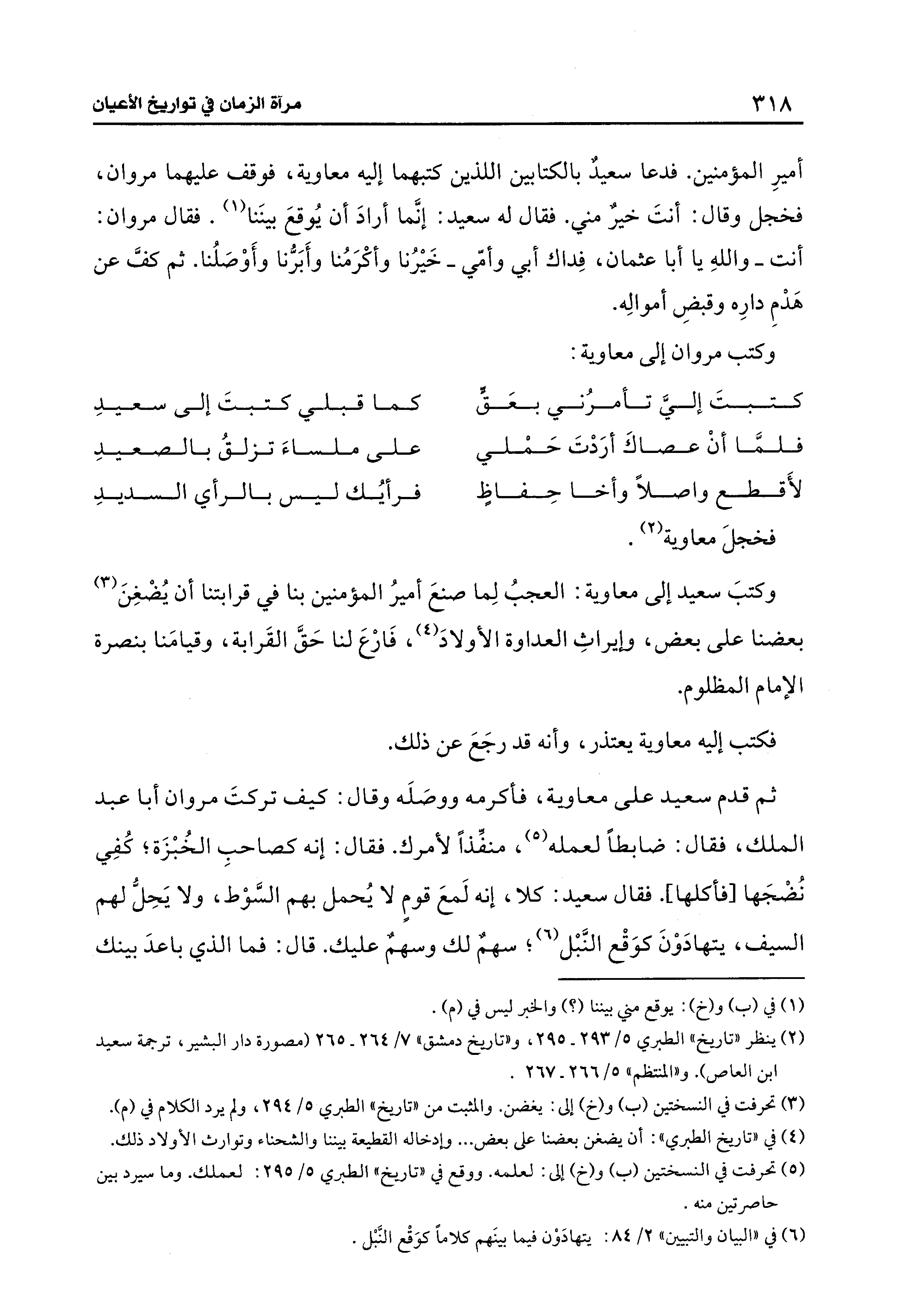 وكتبَ سعيد إلى معاوية: العجبُ لِما صنعَ أميرُ المؤمنين بنا في قرابتنا أن يُضْغِنَ (¬3) بعضنا على بعض، وإيراثِ العداوة الأولادَ (¬4)، فَارْعَ لنا حَقَّ القَرابة، وقيامَنا بنصرة الإمام المظلوم.