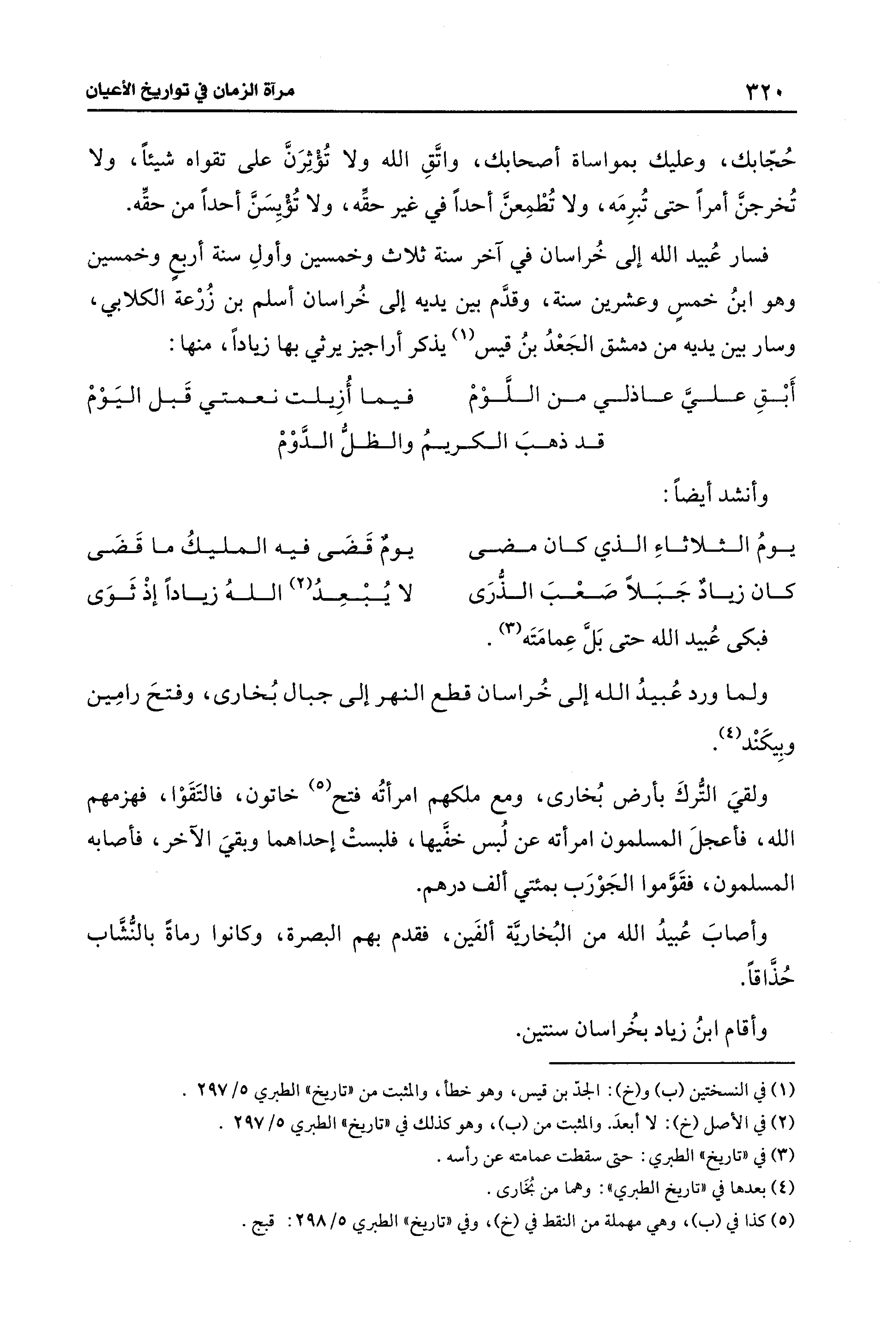 فسار عُبيد الله إلى خُراسان في آخر سنة ثلاث وخمسين وأولِ سنة أربعٍ وخمسين وهو ابنُ خمس وعشرين سنة، وقدَّم بين يديه إلى خُراسان أسلم بن زُرْعة الكلابي، وسار بين يديه من دمشق الجَعْدُ بنُ قيس (¬1) يذكر أراجيز يرثي بها زيادًا، منها:
