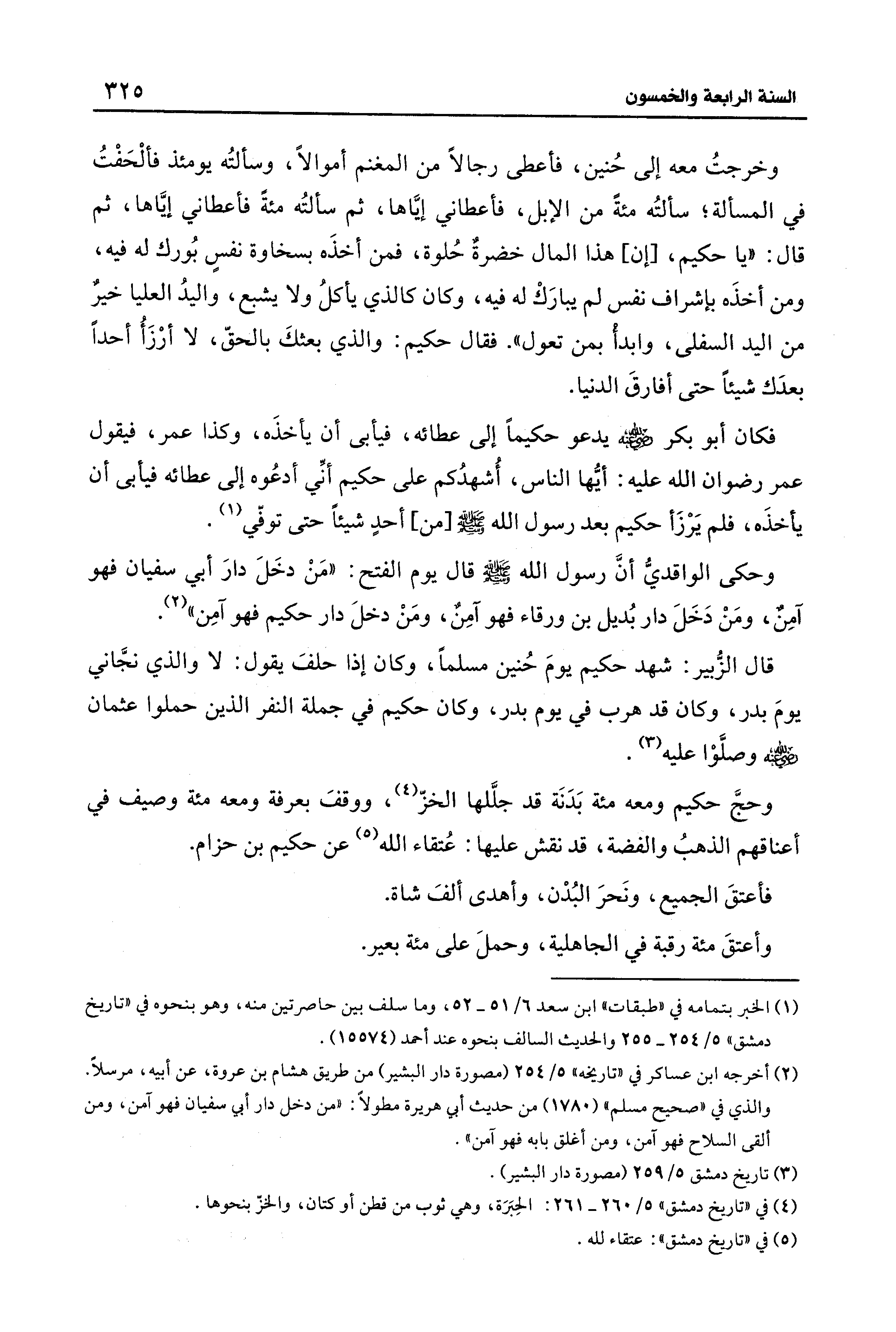 وخرجتُ معه إلى حُنين، فاعطى رجالًا من المغنم أموالًا، وسألتُه يومئذ فألْحَفْتُ في المسألة؛ سألتُه مئةً من الإبل، فأعطاني إياها، ثم سألتُه مئة فأعطاني إيَّاها، ثم قال: "يا حكيم، [إن] هذا المال خضرةٌ حُلوة، فمن أخذَه بسخاوة نفسٍ بُورك له فيه، ومن أخذَه بإشراف نفس لم يبارَكْ له فيه، وكان كالذي يأكلُ ولا يشبع، واليدُ العليا خيرٌ من اليد السفلى، وابدأ بمن تعول". فقال حكيم: والذي بعثكَ بالحقّ، لا أرْزَأُ أحدًا بعدَك شيئًا حتى أفارقَ الدنيا.