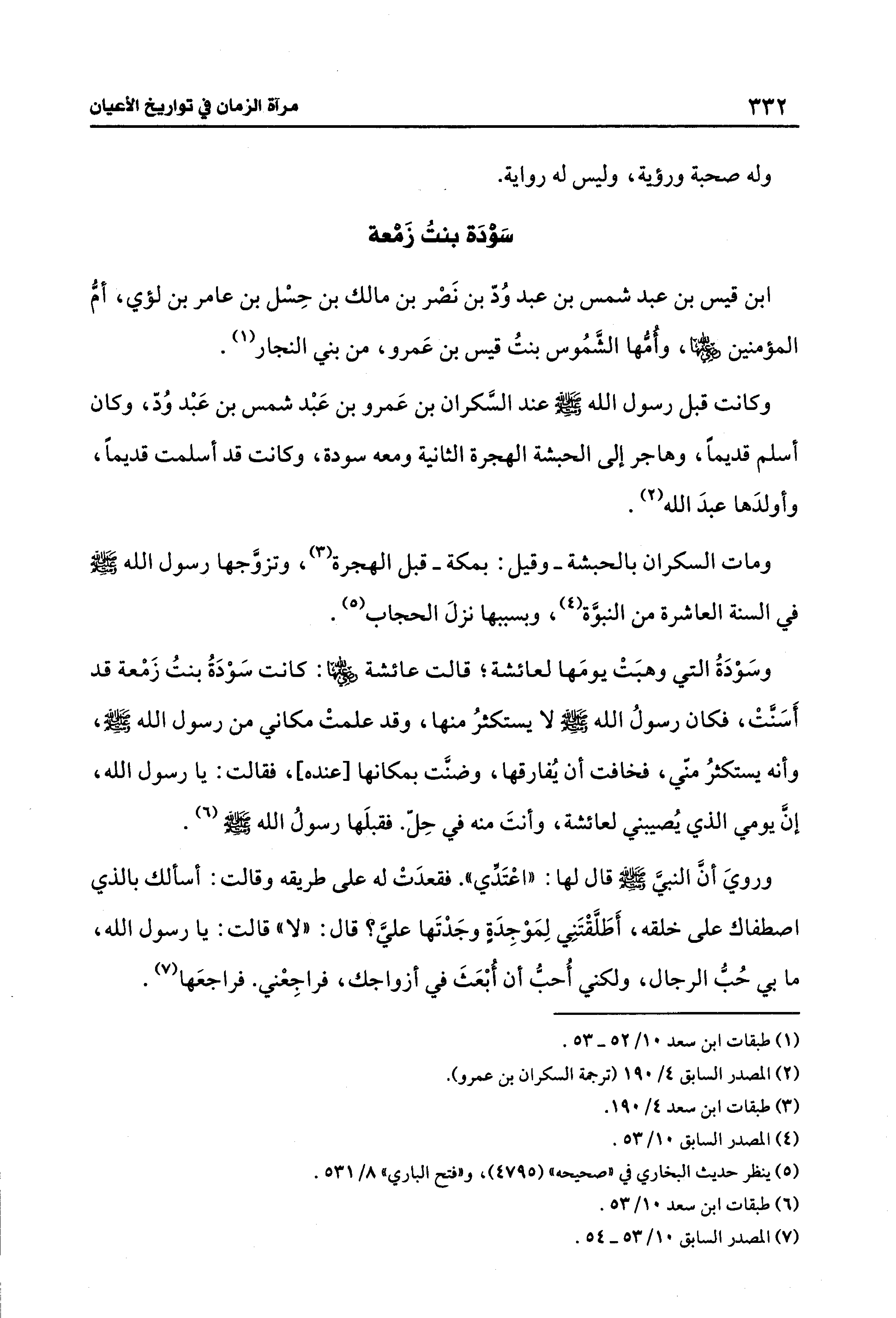 وسَوْدَةُ التي وهبَتْ يومَها لعائشة؛ قالت عائشة - رضي الله عنهما -: كانت سَوْدَةُ بنتُ زَمعة قد أَسَنَّتْ، فكان رسولُ الله - صلى الله عليه وسلم - لا يستكثرُ منها، وقد علمتْ مكاني من رسول الله - صلى الله عليه وسلم -، وأنه يستكثرُ مني، فخافت أن يُفارقها، وضنَّت بمكانها [عنده]، فقالت: يا رسول الله، إنَّ يومي الذي يُصيبني لعائشة، وأنتَ منه في حِل. فقبلَها رسولُ الله - صلى الله عليه وسلم - (¬6).