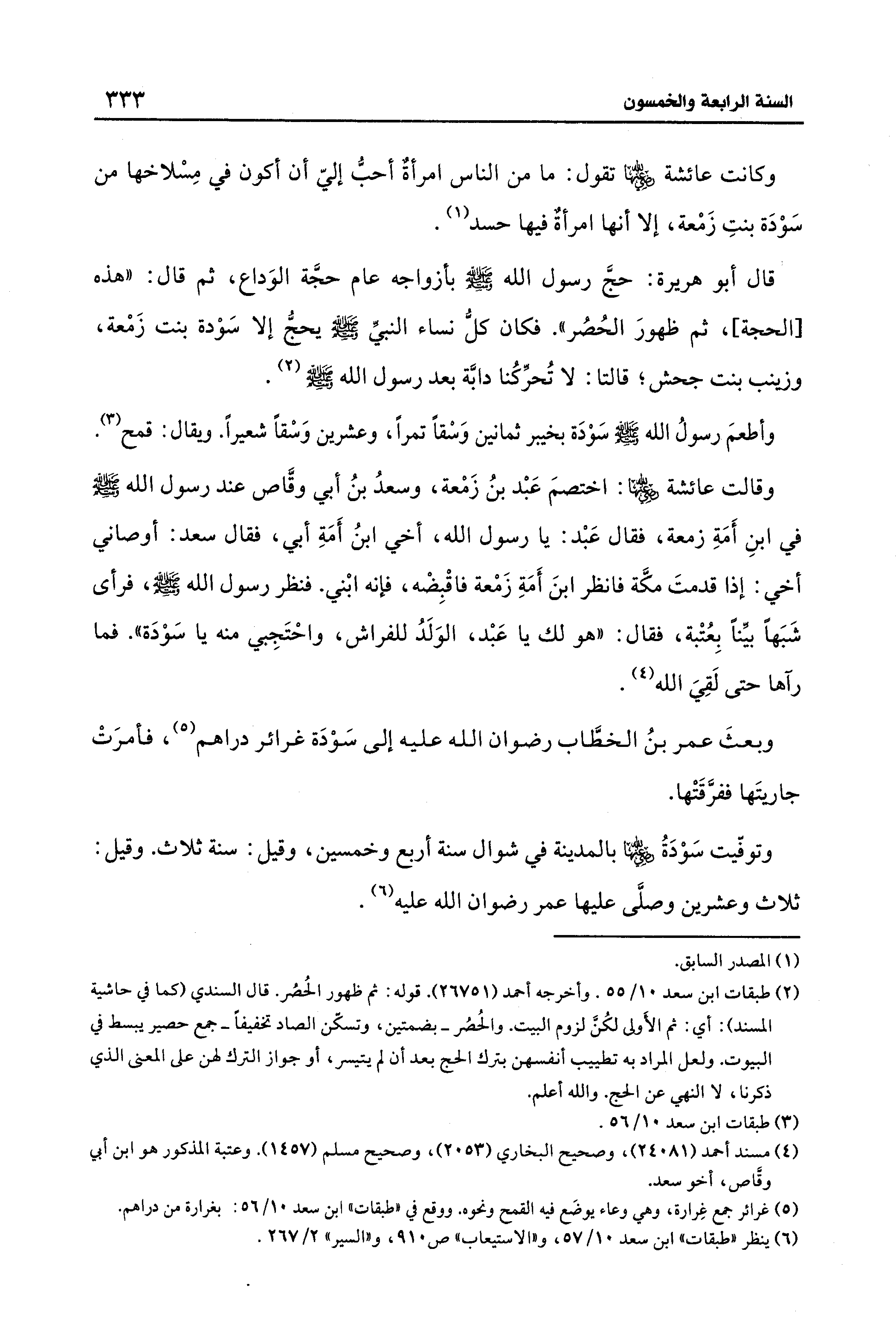 وتوفّيت سَوْدَةُ - رضي الله عنها - بالمدينة في شوال سنة أربع وخمسين، وقيل: سنة ثلاث. وقيل: ثلاث وعشرين وصلَّى عليها عمر رضوان الله عليه (¬6).