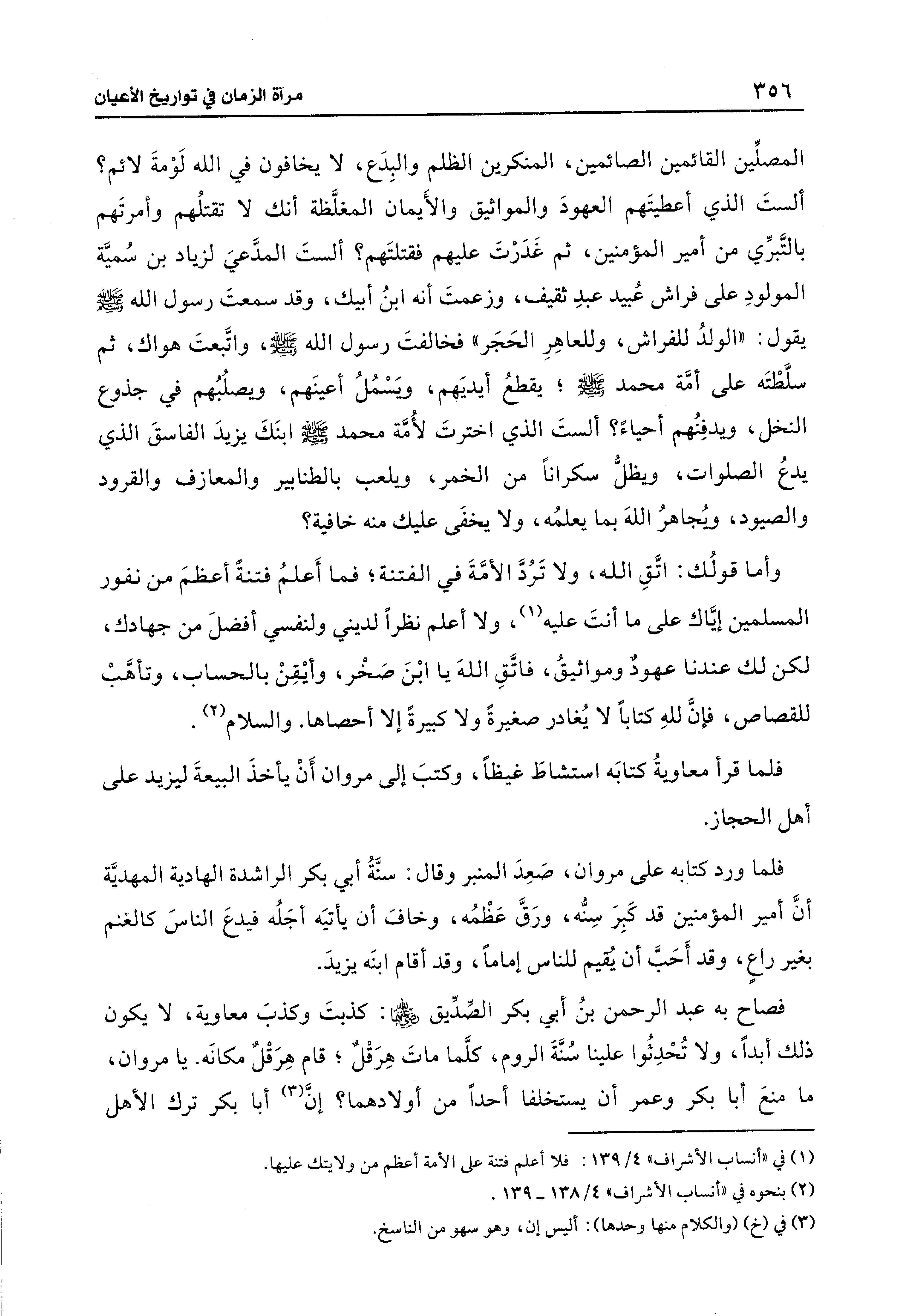 المصلِّين القائمين الصائمين، المنكرين الظلم والبِدَع، لا يخافون في الله لَوْمةَ لائم؟ ألستَ الذي أعطيتَهم العهودَ والمواثيق والأَيمان المغلَّظة أنك لا تقتلُهم وأمرتَهم بالتَّبرِّي من أمير المؤمنين، ثم غَدَرْتَ عليهم فقتلتَهم؟ ألستَ المدَّعيَ لزياد بن سُميَّة المولودِ على فراش عُبيد عبدِ ثقيف، وزعمتَ أنه ابنُ أبيك، وقد سمعتَ رسول الله - صلى الله عليه وسلم - يقول: "الولدُ للفراش، وللعاهِرِ الحَجَر" فخالفتَ رسول الله - صلى الله عليه وسلم -، واتَّبعتَ هواك، ثم سلَّطْتَه على أمَّة محمد - صلى الله عليه وسلم -؛ يقطعُ أيديَهم، ويَسْمُلُ أعينَهم، ويصلُبُهم في جذوع النخل، ويدفِنُهم أحياءً؟ ألستَ الذي اخترتَ لأُمَّة محمد - صلى الله عليه وسلم - ابنَكَ يزيدَ الفاسقَ الذي يدعُ الصلوات، ويظلُّ سكرانًا من الخمر، ويلعب بالطنابير والمعازف والقرود والصيود، ويُجاهرُ الله بما يعلمُه، ولا يخفَى عليك منه خافية؟