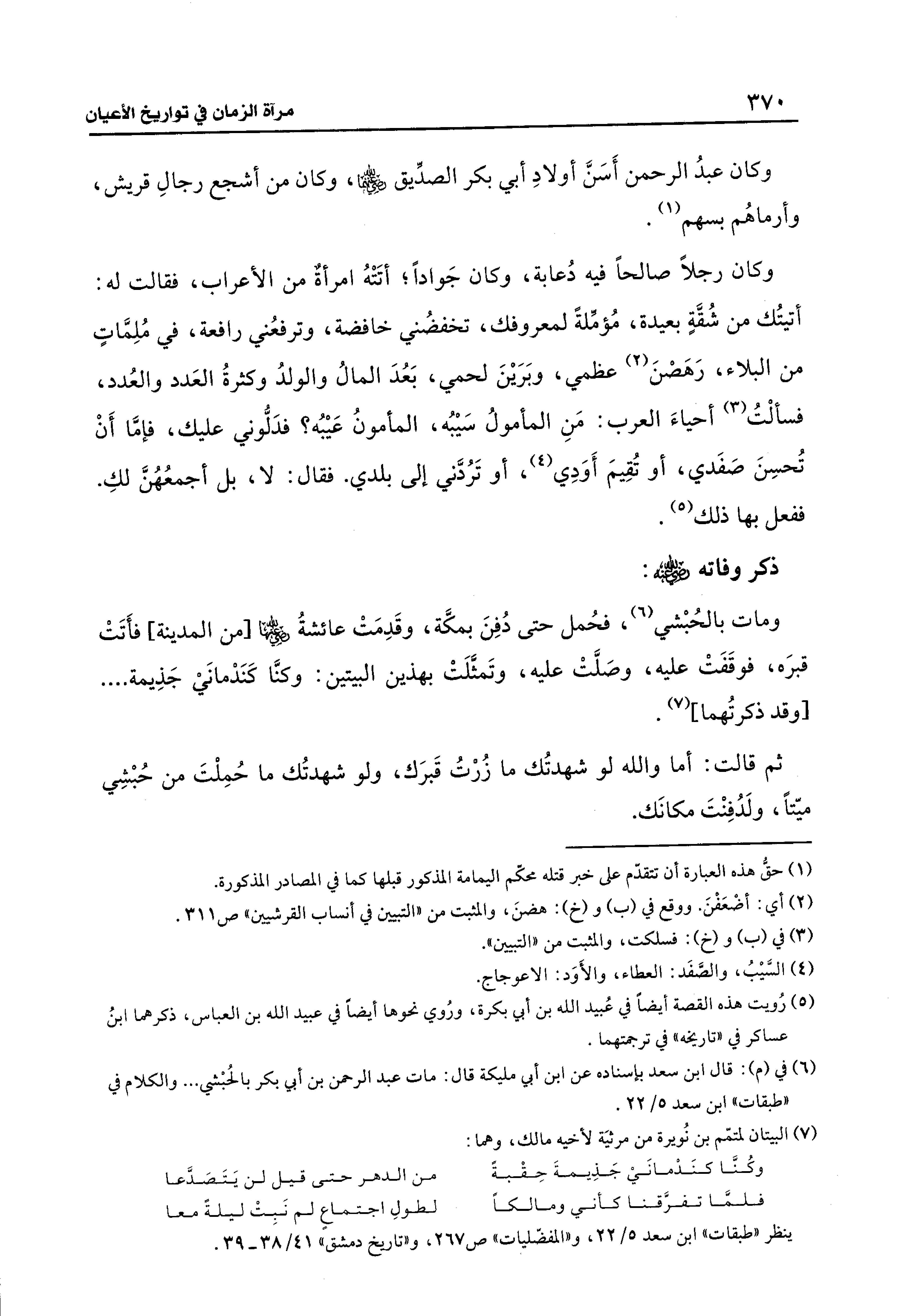 ومات بالحُبْشي (¬6)، فحُمل حتى دُفِنَ بمكَّة، وقَدِمَتْ عائشة - رضي الله عنها -[من المدينة] فأَتَتْ قبرَه، فوقَفَتْ عليه، وصَلَّتْ عليه، وتَمثَّلَتْ بهذين البيتين: وكنَّا كَنَدْمانَي جَذِيمة. . .