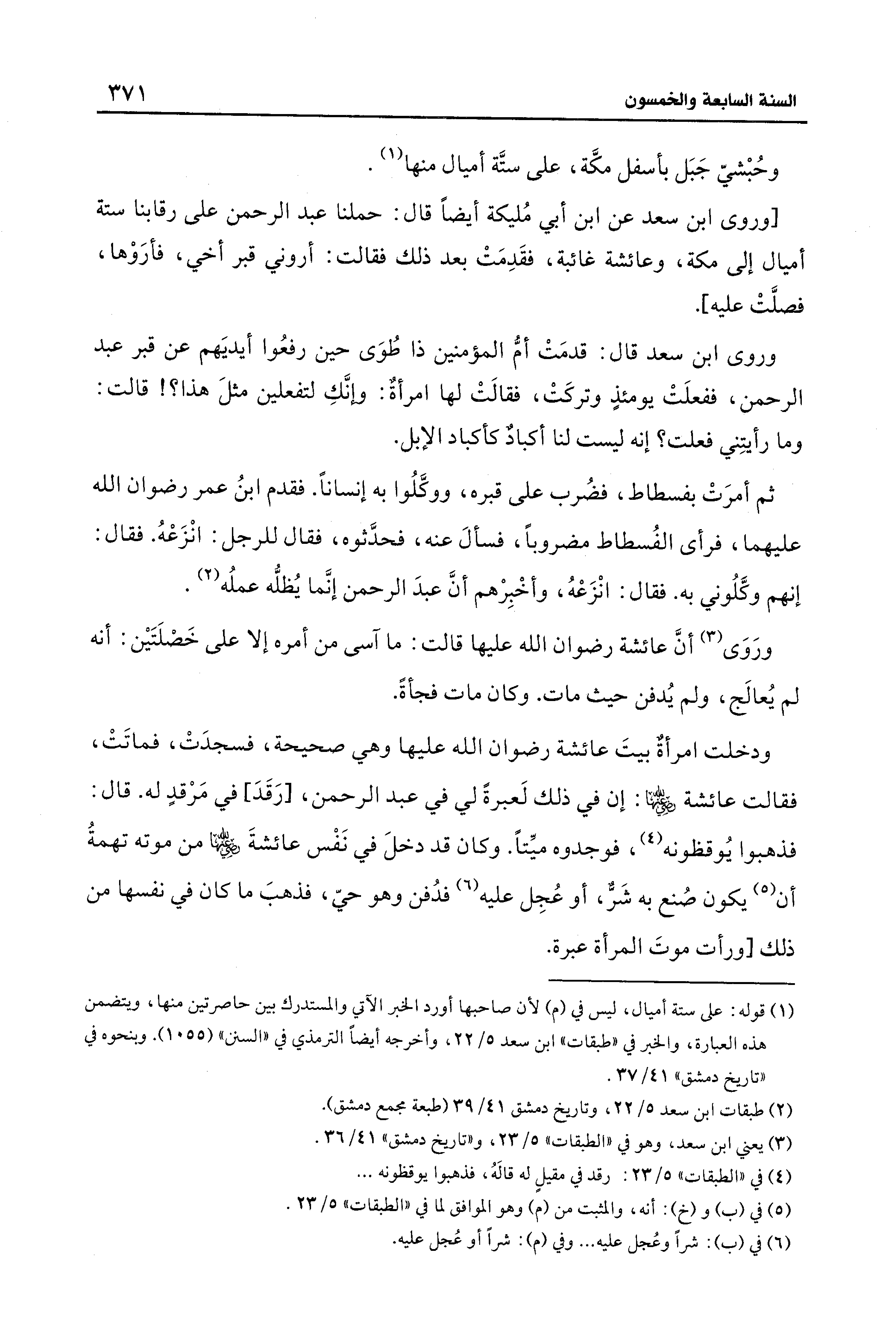 ودخلت امرأةٌ بيتَ عائشة رضوان الله عليها وهي صحيحة، فسجدَتْ، فماتَتْ، فقالت عائشة - رضي الله عنها -: إن في ذلك لَعبرةً لي في عبد الرحمن، [رَقَدَ] في مَرْقدٍ له. قال: فذهبوا يُوقظونه (¬4)، فوجدوه ميِّتًا. وكان قد دخلَ في نَفْس عائشةَ - رضي الله عنها - من موته تهمةُ أن (¬5) يكون صُنع به شَرٌّ، أو عُجِل عليه (¬6) فدُفن وهو حيّ، فذهبَ ما كان في نفسها من ذلك [ورأت موتَ المرأة عبرة.