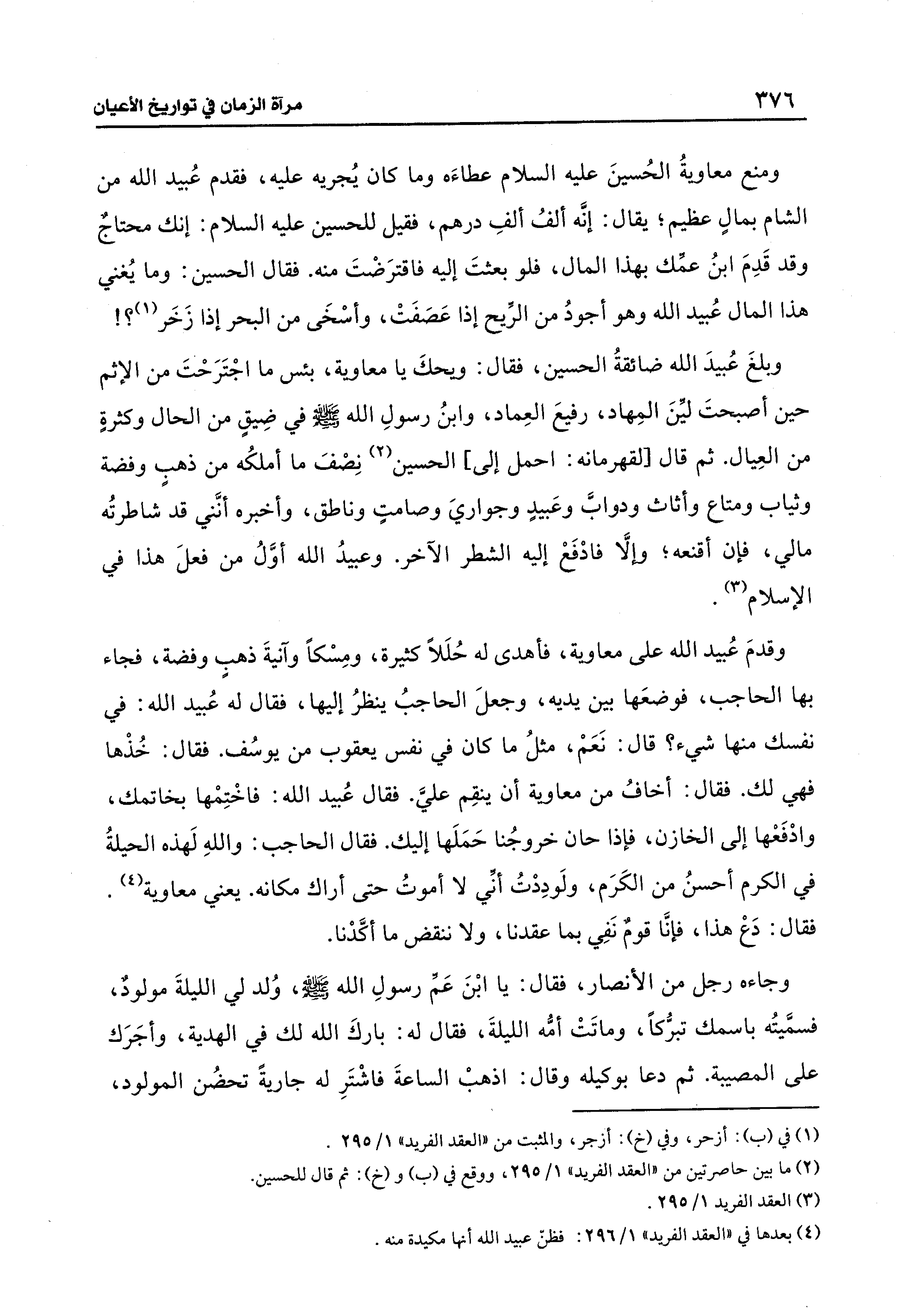 وبلغَ عُبيدَ الله ضائقةُ الحسين، فقال: ويحكَ يا معاوية، بئس ما اجْتَرَحْتَ من الإثم حين أصبحتَ ليِّنَ المِهاد، رفيعَ العِماد، وابنُ رسولِ الله - صلى الله عليه وسلم - في ضِيقٍ من الحال وكثرةٍ من العِيال. ثم قال [لقهرمانه: احمل إلى] الحسين (¬2) نِصْفَ ما أملكُه من ذهبٍ وفضة وثياب ومتاع وأثاث ودوابَّ وعَبيدٍ وجواريَ وصامتٍ وناطق، وأخبره أنَّني قد شاطرتُه مالي، فإن أقنعه؛ وإلا فادْفَعْ إليه الشطر الآخر. وعبيدُ الله أوَّلُ من فعلَ هذا في الإسلام (¬3).