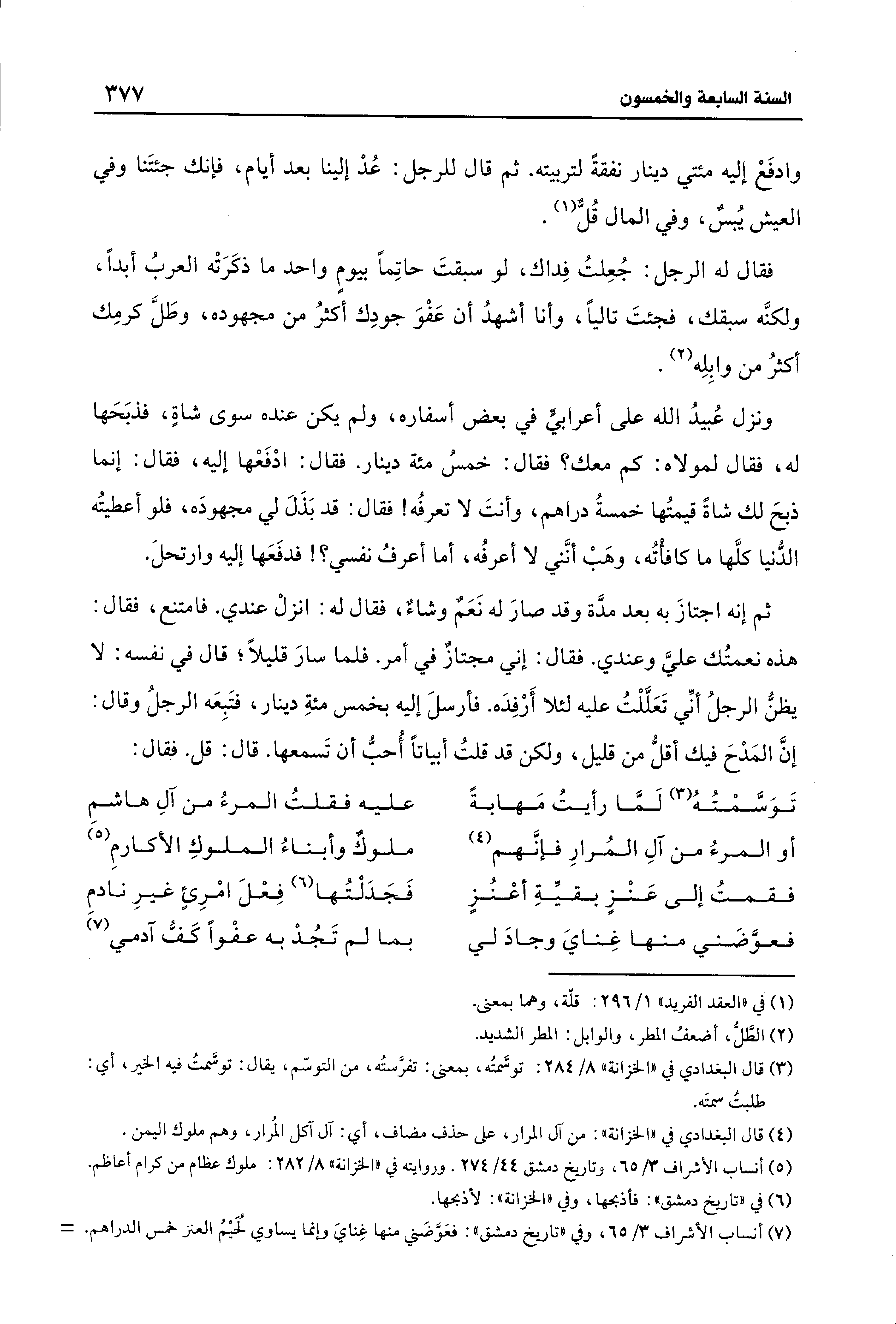 ثم إنه اجتازَ به بعد مدَّة وقد صارَ له نَعَمٌ وشاءٌ، فقال له: انزلْ عندي. فامتنع، فقال: هذه نعمتُك عليَّ وعندي. فقال: إني مجتازٌ في أمر. فلما سارَ قليلًا؛ قال في نفسه: لا يظنُّ الرجلُ أنِّي تَعَلَّلْتُ عليه لئلا أَرْفِدَه. فأرسلَ إليه بخمس مئةِ دينار، فتَبِعَه الرجلُ وقال: إنَّ المَدْحَ فيك أقلُّ من قليل، ولكن قد قلتُ أبياتًا أُحبُّ أن تَسمعها. قال: قل. فقال: