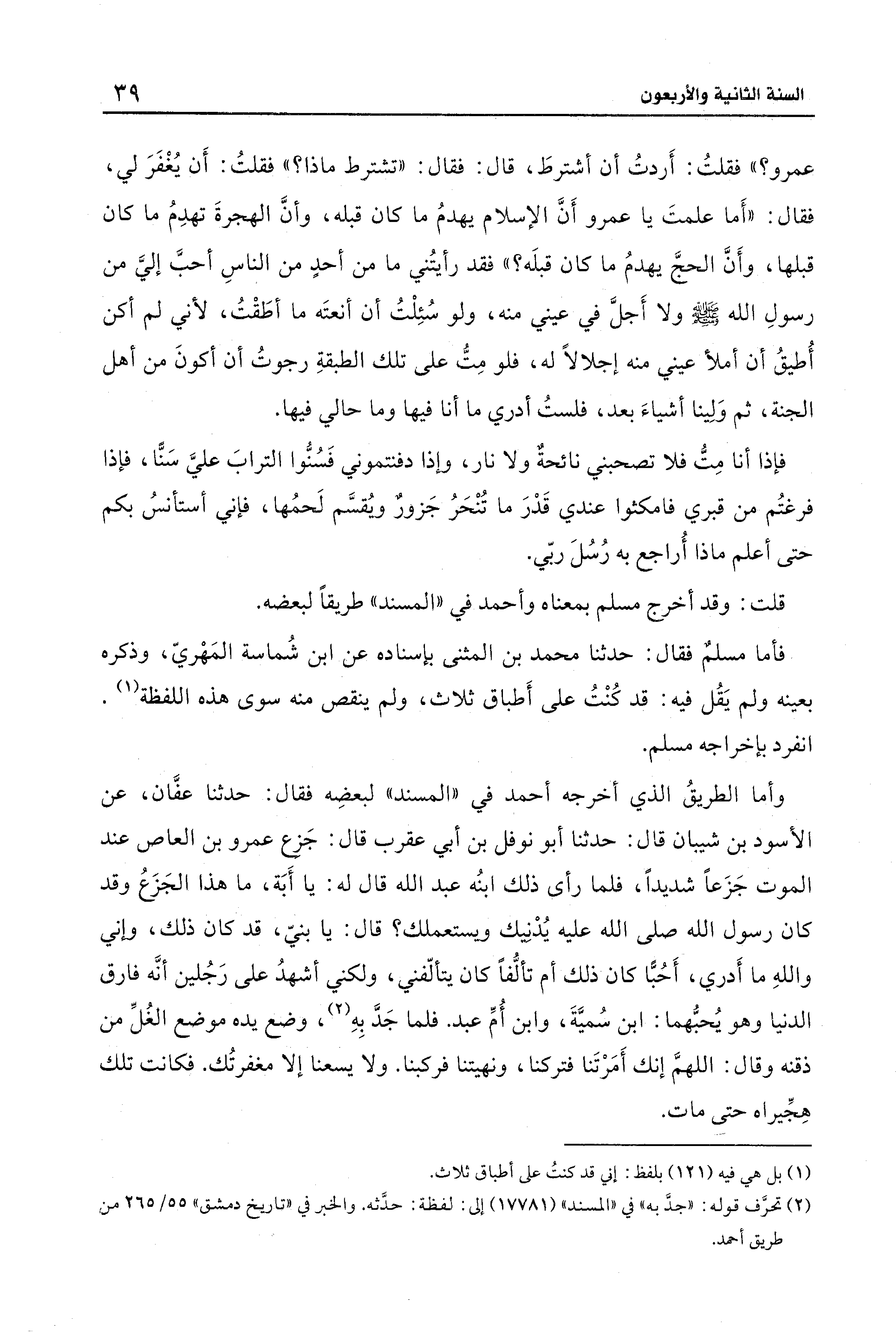 عمرو؟ " فقلتُ: أَردتُ أن أشترطَ، قال: فقال: "تشترط ماذا؟ " فقلتُ: أَن يُغْفَرَ لي، فقال: "أَما علمتَ يا عمرو أَنَّ" الإسلام يهدمُ ما كان قبله، وأنَّ الهجرةَ تهدِمُ ما كان قبلها، وأَنَّ الحجَّ يهدمُ ما كان قبلَه؟ " فقد رأيتُني ما من إحدٍ من الناسِ أحبَّ إليَّ من رسولِ الله - صلى الله عليه وسلم - ولا أَجلَّ في عيني منه، ولو سُئِلْتُ أن أنعتَه ما أطَقْتُ، لأني لم أكن أُطيقُ أن أَملأ عيني منه إجلالًا له، فلو مِتُّ على تلك الطبقةِ رجوتُ أن أكونَ من أهل الجنة، ثم وَلِينا أشياءَ بعد، فلستُ أدري ما أنا فيها وما حالي فيها.