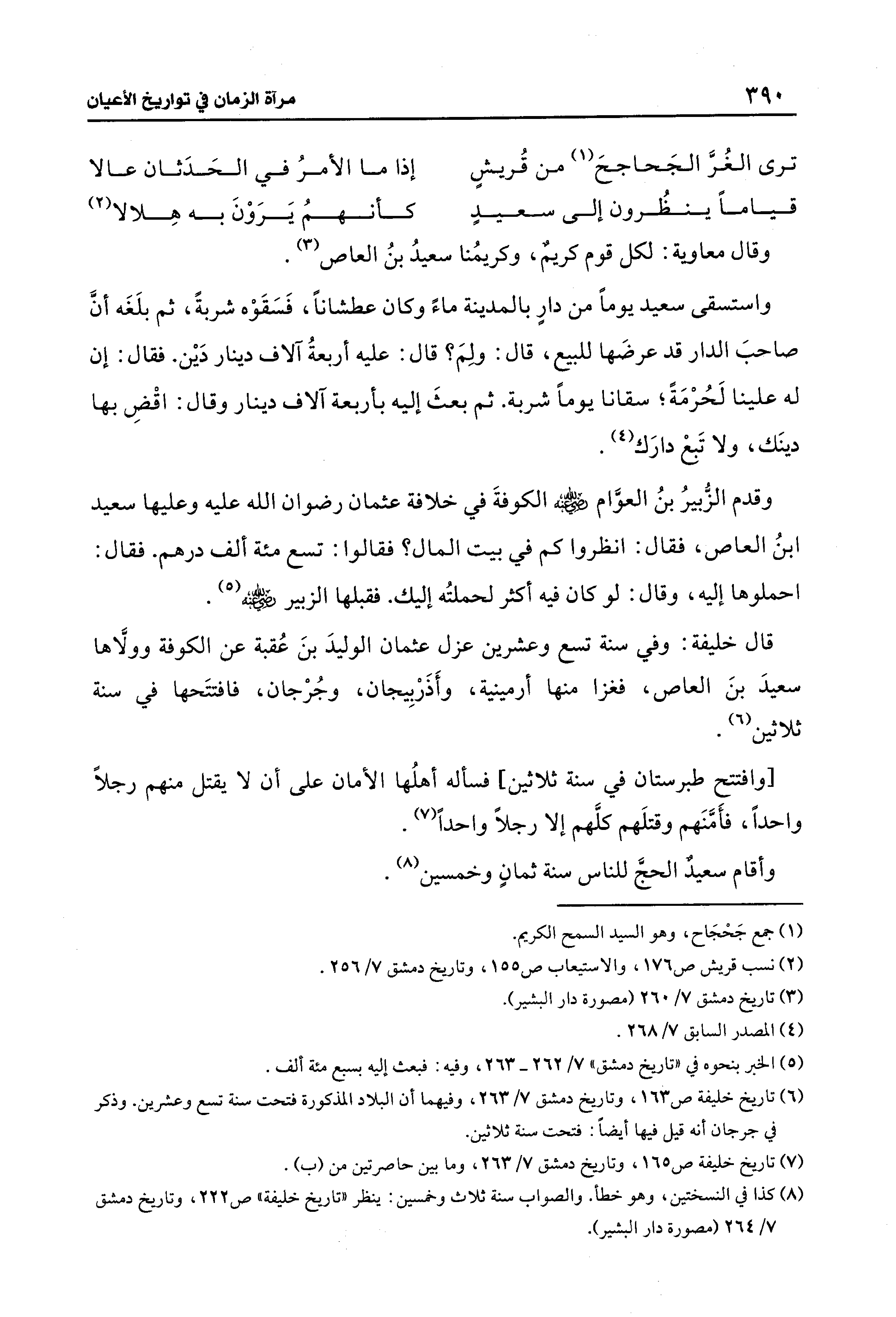 وقدم الزُّبيرُ بنُ العوَّام - رضي الله عنه - الكوفةَ في خلافة عثمان رضوان الله عليه وعليها سعيد بنُ العاص، فقال: انظروا كم في بيت المال؟ فقالوا: تسع مئة ألف درهم. فقال: احملوها إليه، وقال: لو كان فيه أكثر لحملتُه إليك. فقبلها الزبير - رضي الله عنه - (¬5).