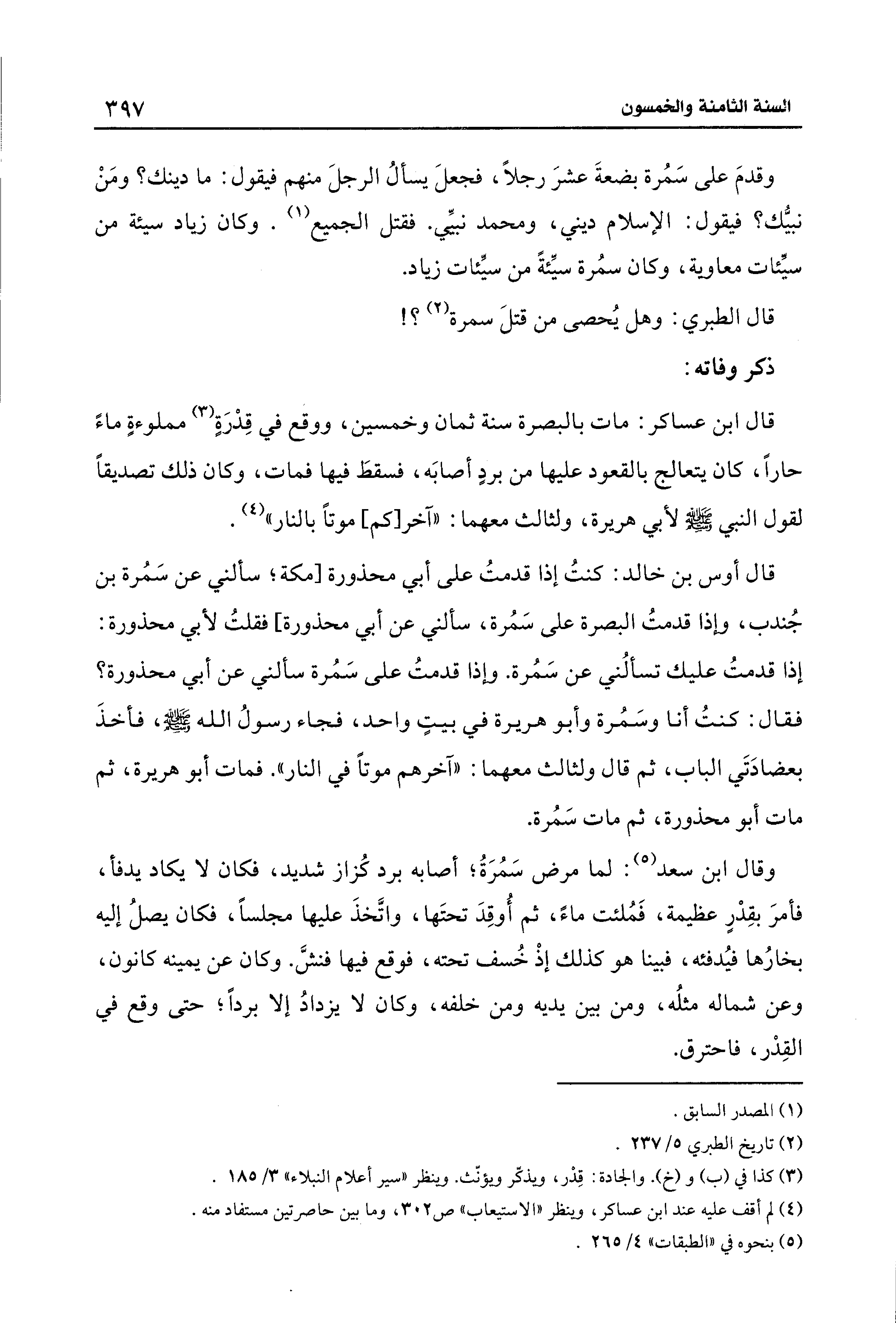 وقال ابن سعد (¬5): لما مرض سَمُرَةُ؛ أصابه برد كُزاز شديد، فكان لا يكاد يدفأ، فأمرَ بقِدْرٍ عظيمة، فَمُلئت ماءً، ثم أُوقِدَ تحتَها، واتَّخذَ عليها مجلسًا، فكان يصلُ إليه بخارُها فيُدفئه، فبينا هو كذلك إذْ خُسف تحته، فوقع فيها فنشَّ. وكان عن يمينه كانون، وعن شماله مثلُه، ومن بين يديه ومن خلفه، وكان لا يزدادُ إلا بردًا؛ حتى وقع في القِدْر، فاحترق.