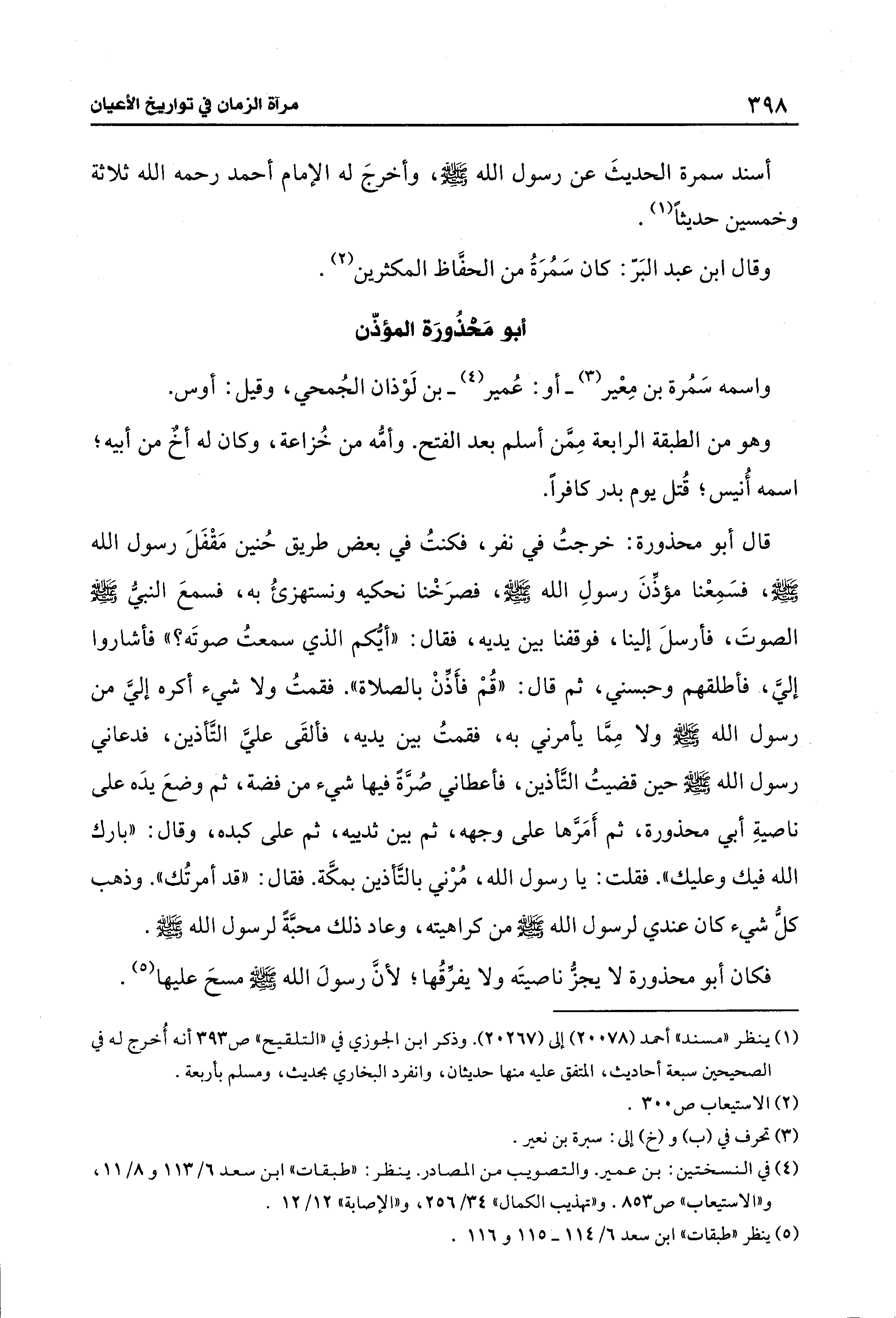 قال أبو محذورة: خرجتُ في نفر، فكنتُ في بعض طريق حُنين مَقْفَلَ رسول الله - صلى الله عليه وسلم -، فسَمِعْنا مؤذِّنَ رسولِ الله - صلى الله عليه وسلم -، فصرَخْنا نحكيه ونستهزئُ به، فسمعَ النبيُّ - صلى الله عليه وسلم - الصوتَ، فأرسلَ إلينا، فوقفنا بين يديه، فقال: "أيُّكم الذي سمعتُ صوتَه؟ " فأشاروا إليَّ، فأطلقهم وحبسني، ثم قال: "قُمْ فأَذِّنْ بالصلاة". فقمتُ ولا شيء أكره إليَّ من رسول الله - صلى الله عليه وسلم - ولا مِمَّا يأمرني به، فقمتُ بين يديه، فألقَى عليَّ التَّأذين، فدعاني رسول الله - صلى الله عليه وسلم - حين قضيتُ التَّأذين، فأعطاني صُرَّةً فيها شيء من فضة، ثم وضعَ يدَه على ناصيةِ أبي محذورة، ثم أَمَرَّها على وجهه، ثم بين ثدييه، ثم على كبده، وقال: "بارك الله فيك وعليك". فقلت: يا رسول الله، مُرْني بالتَّأذين بمكَّة. فقال: "قد أمرتُك". وذهب كل شيء كان عندي لرسول الله - صلى الله عليه وسلم - من كراهيته، وعاد ذلك محبَّةً لرسول الله - صلى الله عليه وسلم -.