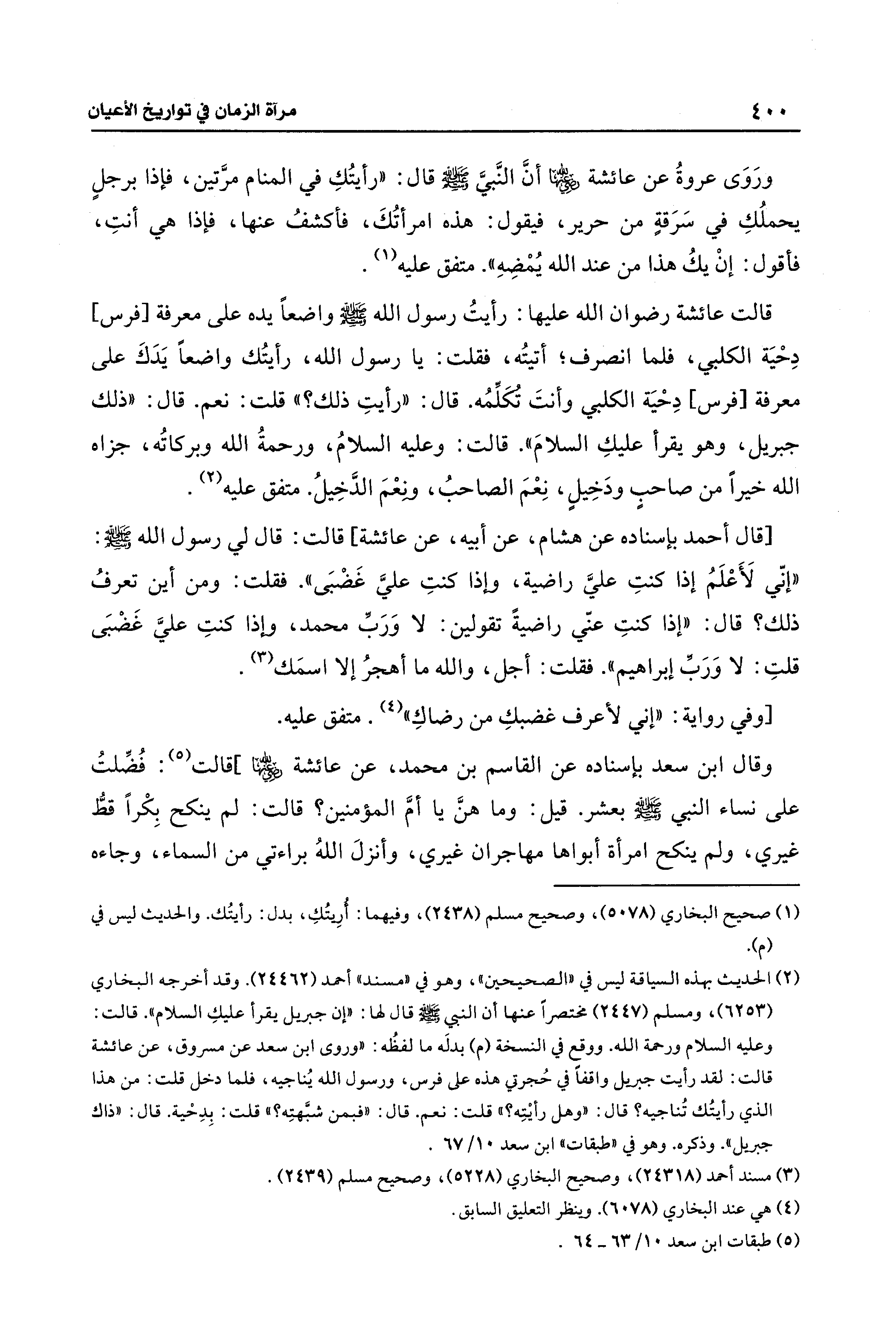 (¬2) الحديث بهذه السياقة ليس في "الصحيحين"، وهو في "مسند" أحمد (24462). وقد أخرجه البخاري (6253)، ومسلم (2447) مختصرًا عنها أن النبي - صلى الله عليه وسلم - قال لها: "إن جبريل يقرأ عليكِ السلام". قالت: و - عليه السلام - ورحمة الله. ووقع في النسخة (م) بدلَه ما لفظُه: "وروى ابن سعد عن مسروق، عن عائشة قالت: لقد رأيت جبريل واقفًا في حُجرتي هذه على فرس، ورسول الله يُناجيه، فلما دخل قلت: من هذا الذي رأيتُك تُناجيه؟ قال: "وهل رأيتِه؟ " قلت: نعم. قال: "فبمن شبَّهتِه؟ " قلت: بِدِحْية. قال: "ذاك جبريل". وذكره. وهو في "طبقات" ابن سعد 10/ 67.