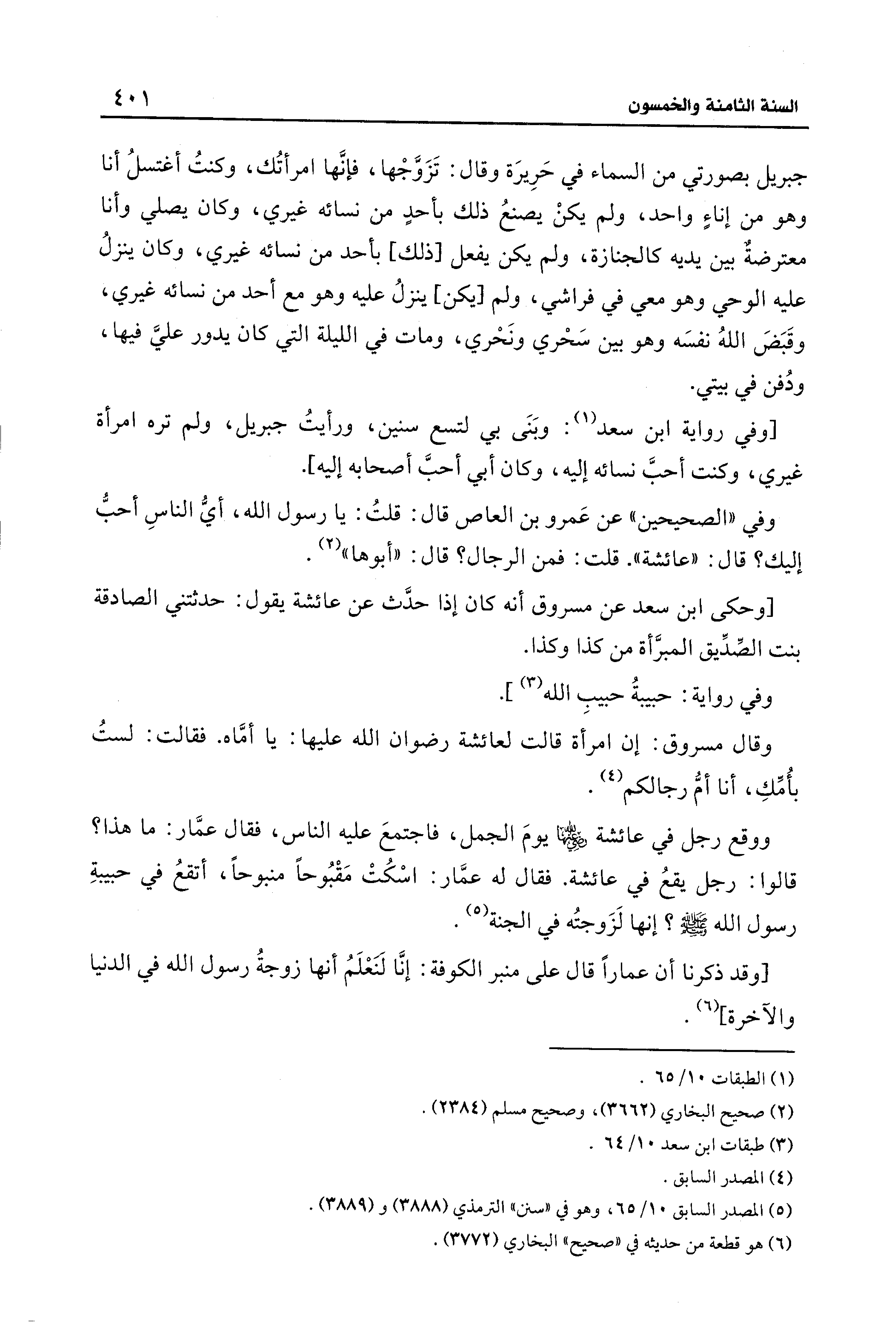 جبريل بصورتي من السماء في حَرِيرَة وقال: تَزَوَّجْها، فإنَّها امرأتُك، وكنتُ أغتسلُ أنا وهو من إناءٍ واحد، ولم يكنْ يصنعُ ذلك بأحدٍ من نسائه غيري، وكان يصلي وأنا معترضةٌ بين يديه كالجنازة، ولم يكن يفعل [ذلك] بأحد من نسائه غيري، وكان ينزل عليه الوحي وهو معي في فراشي، ولم [يكن] ينزلُ عليه وهو مع أحد من نسائه غيري، وقَبَضَ اللهُ نفسَه وهو بين سَحْري ونَحْري، ومات في الليلة التي كان يدور عليَّ فيها، ودُفن في بيتي.