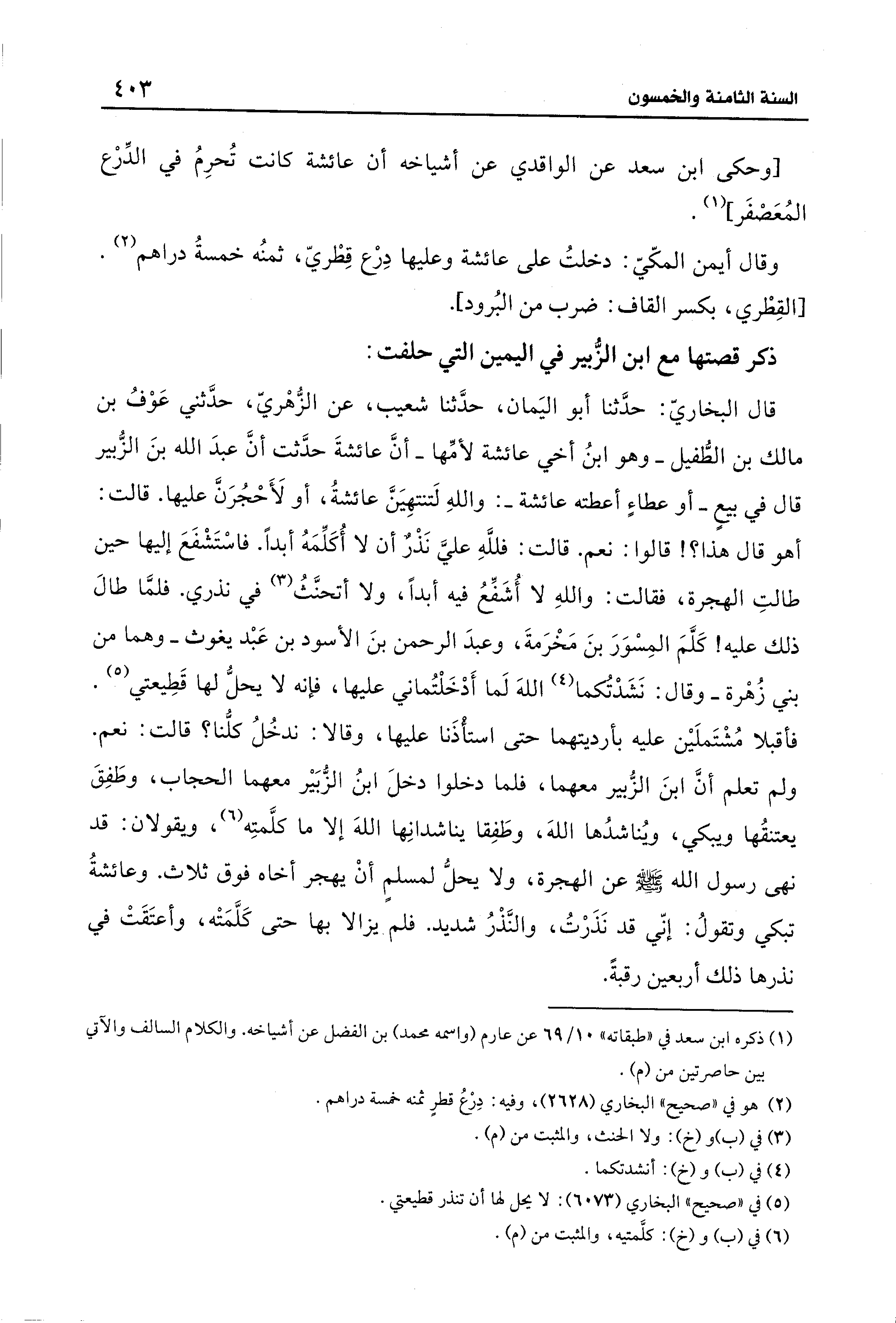 قال البخاريّ: حدَّثنا أبو اليَمان، حدَّثنا شعيب، عن الزُّهْريّ، حدَّثني عَوْفُ بن مالك بن الطُّفيل -وهو ابنُ أخي عائشة لأمِّها- أنَّ عائشةَ حدَّثت أنَّ عبدَ الله بنَ الزُّبير قال في بيعٍ -أو عطاءٍ أعطته عائشة-: واللهِ لَتنتهِيَنَّ عائشةُ، أو لَأَحْجُرَنَّ عليها. قالت: أهو قال هذا؟ ! قالوا: نعم. قالت: فللَّهِ عليَّ نَذْرٌ أن لا أُكَلِّمَهُ أبدًا. فاسْتَشْفَعَ إليها حين طالتِ الهجرة، فقالت: واللهِ لا أُشَفِّعُ فيه أبدًا، ولا أتحنَّثُ (¬3) في نذري. فلمَّا طال ذلك عليه! كَلَّمَ المِسْوَرَ بنَ مَخْرَمةَ، وعبدَ الرحمن بنَ الأسود بن عَبْد يغوث -وهما من بني زُهْرة- وقال: نَشَدْتُكما (¬4) اللهَ لَما أَدْخَلْتُماني عليها، فإنه لا يحلُّ لها قَطِيعتي (¬5). فأقبلا مُشْتَملَين عليه بأرديتهما حتى استأْذَنا عليها، وقالا: ندخُلُ كلُّنا؟ قالت: نعم. ولم تعلم أنَّ ابنَ الزُّبير معهما، فلما دخلوا دخلَ ابنُ الزُّبَير معهما الحجاب، وطَفِقَ يعتنقُها ويبكي، ويناشدُها اللهَ، وطَفِقا يناشدانِها اللهَ إلا ما كلَّمتِه (¬6)، ويقولان: قد نهى رسول الله - صلى الله عليه وسلم - عن الهجرة، ولا يحلُّ لمسلمٍ أنْ يهجر أخاه فوق ثلاث. وعائشةُ تبكي وتقولُ: إنِّي قد نَذَرْتُ، والنَّذْرُ شديد. فلم يزالا بها حتى كَلَّمَتْه، وأعتَقَتْ في نذرها ذلك أربعين رقبةً.