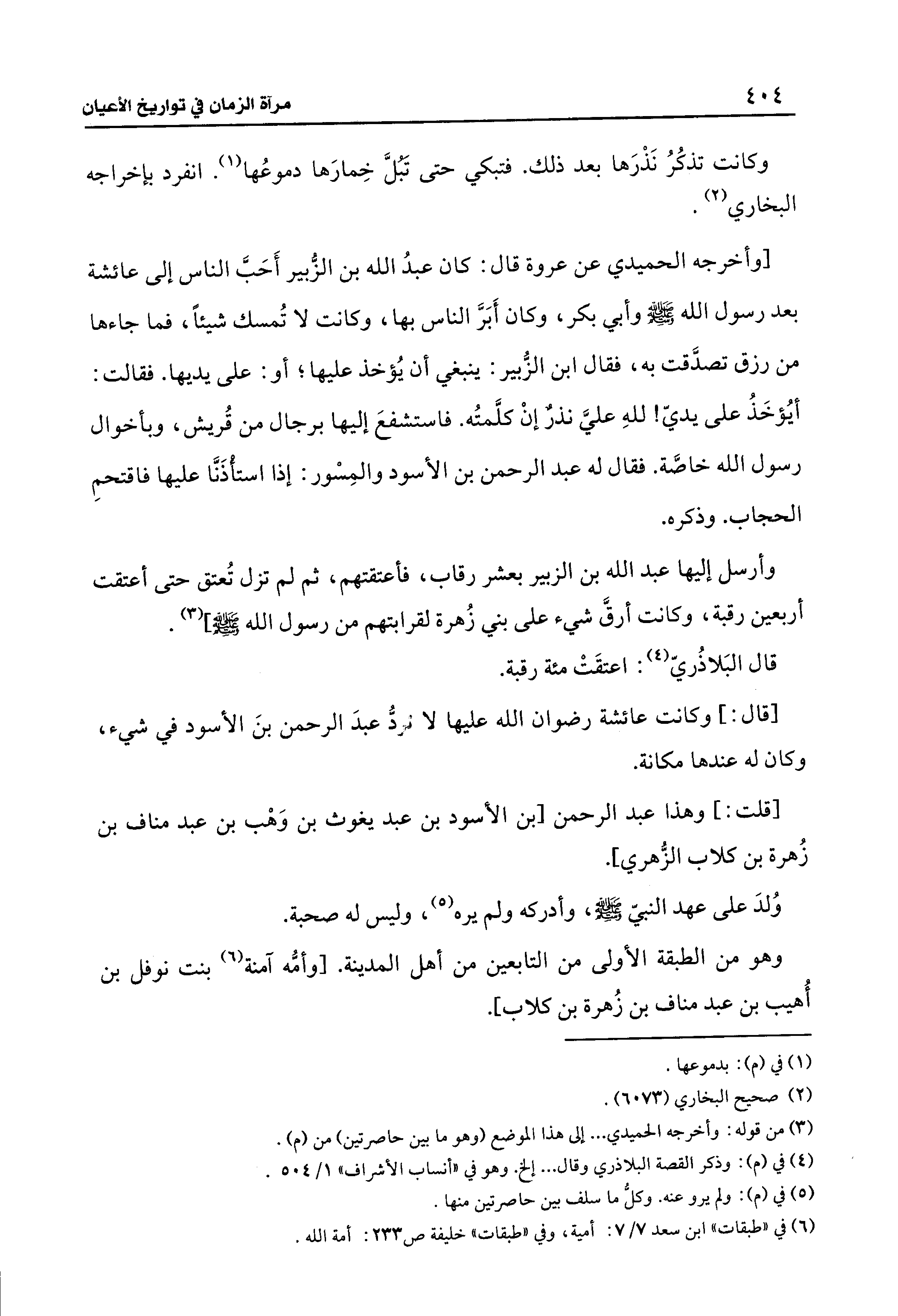 [وأخرجه الحميدي عن عروة قال: كان عبدُ الله بن الزُّبير أَحَبَّ الناس إلى عائشة بعد رسول الله - صلى الله عليه وسلم - وأبي بكر، وكان أَبَرَّ الناس بها، وكانت لا تُمسك شيئًا، فما جاءها من رزق تصدَّقت به، فقال ابن الزُّبير: ينبغي أن يُؤخذ عليها؛ أو: على يديها. فقالت: أيُؤخَذُ على يديّ! للهِ عليَّ نذرٌ إنْ كلَّمتُه. فاستشفعَ إليها برجال من قُريش، وبأخوال رسول الله خاصَّة. فقال له عبد الرحمن بن الأسود والمِسْور: إذا استأْذَنَّا عليها فاقتحمِ الحجاب. وذكره.