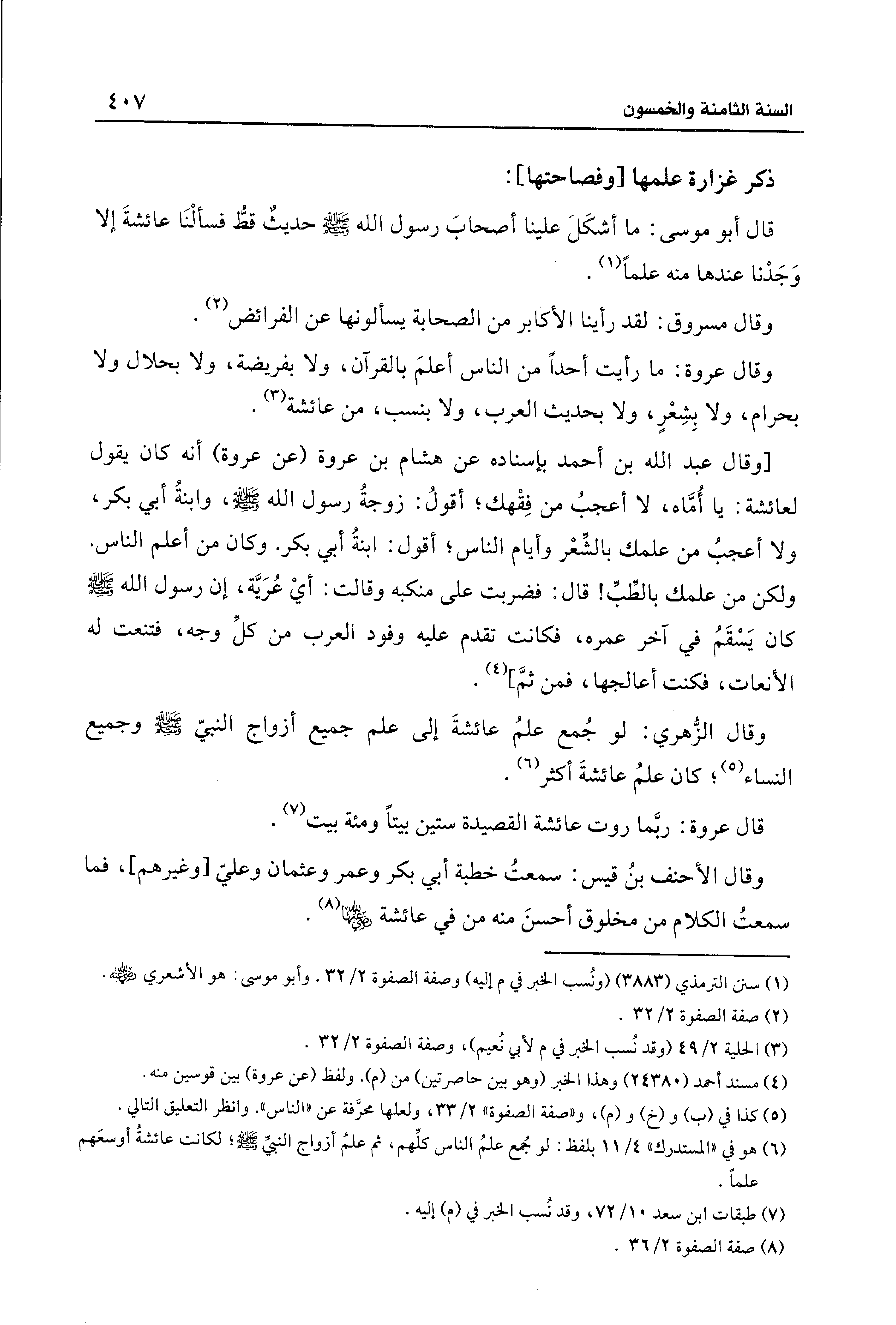 (¬6) هو في "المستدرك" 4/ 11 بلفظ: لو جُمع علمُ الناس كلِّهم، ثم علمُ أزواج النبيِّ - صلى الله عليه وسلم -؛ لكانت عائشةُ أوسعَهم علمًا.