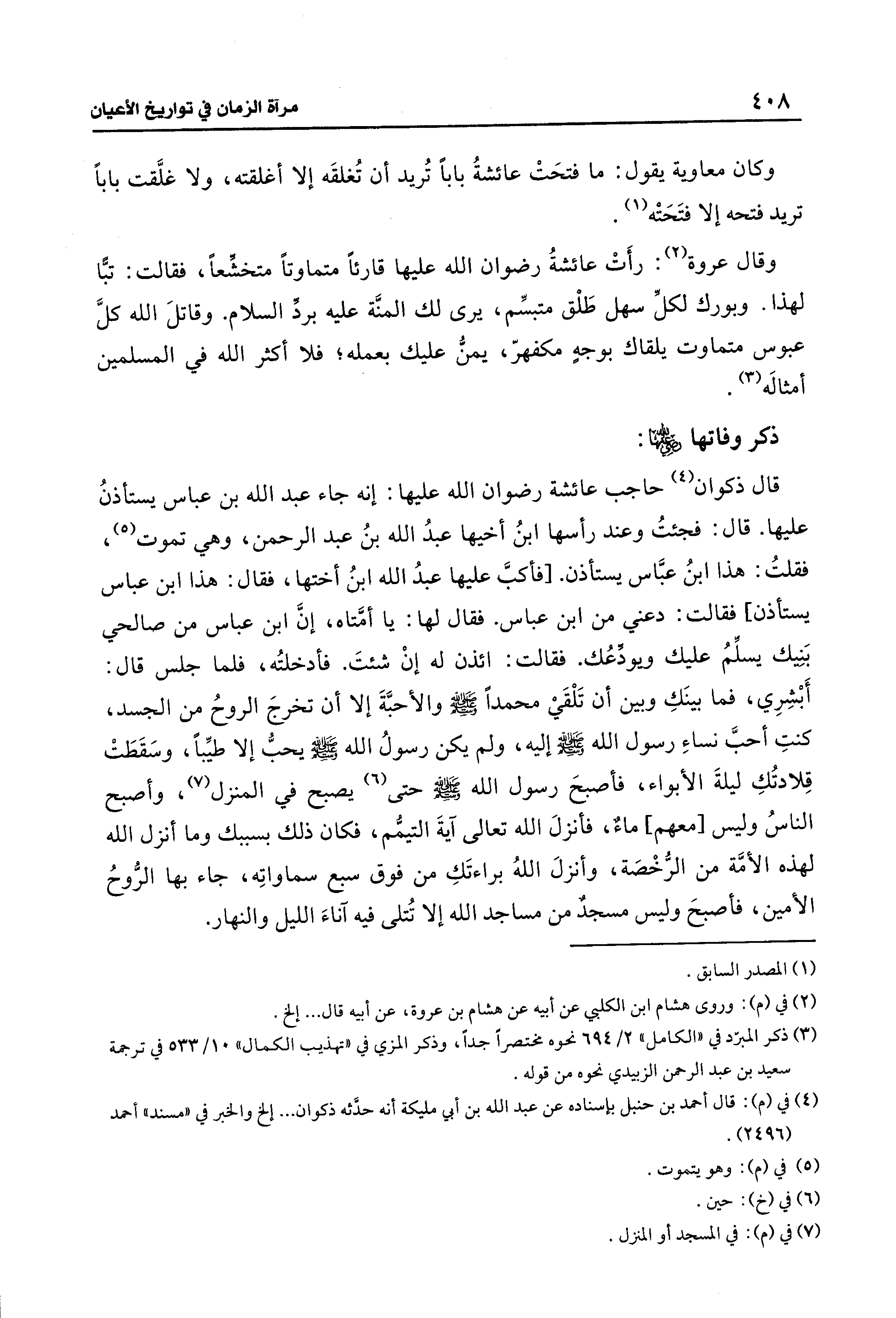قال ذكوان (¬4) حاجب عائشة رضوان الله عليها: إنه جاء عبد الله بن عباس يستأذنُ عليها. قال: فجئتُ وعند رأسها ابنُ أخيها عبدُ الله بنُ عبد الرحمن، وهي تموت (¬5)، فقلتُ: هذا ابنُ عبَّاس يستأذن. [فأكبَّ عليها عبدُ الله ابنُ أختها، فقال: هذا ابن عباس يستأذن] فقالت: دعني من ابن عباس. فقال لها: يا أمَّتاه، إنَّ ابن عباس من صالحي بَنِيك يسلِّمُ عليك ويودِّعُك. فقالت: ائذن له إنْ شئتَ. فأدخلتُه، فلما جلس قال: أَبْشِرِي، فما بينَكِ وبين أن تَلْقَي محمدًا - صلى الله عليه وسلم - والأحبَّةَ إلا أن تخرجَ الروحُ من الجسد، كنتِ أحبَّ نساءِ رسول الله - صلى الله عليه وسلم - إليه، ولم يكن رسولُ الله - صلى الله عليه وسلم - يحبُّ إلا طيِّبًا، وسَقَطَتْ قِلادتُكِ ليلةَ الأبواء، فأصبحَ رسول الله - صلى الله عليه وسلم - حتى (¬6) يصبح في المنزل (¬7)، وأصبح الناسُ وليس [معهم] ماءٌ، فأنزلَ الله تعالى آيةَ التيمُّم، فكان ذلك بسببك وما أنزل الله لهذه الأمَّة من الرُّخْصَة، وأنزلَ اللهُ براءتَكِ من فوق سبع سماواتِه، جاء بها الرُّوحُ الأمين، فأصبحَ وليس مسجدٌ من مساجد الله إلا تُتلى فيه آناءَ الليل والنهار.