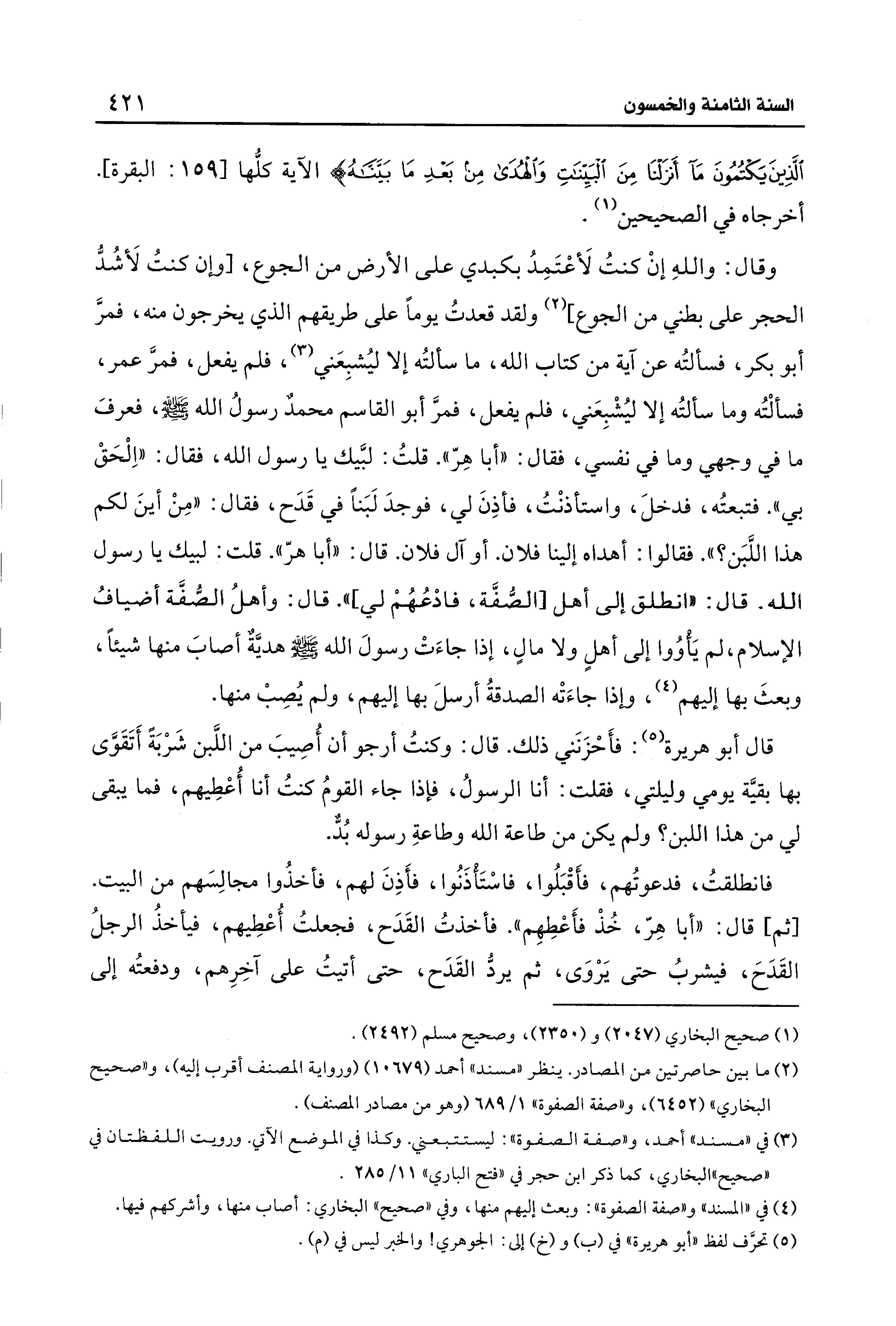 وقال: واللهِ إنْ كنتُ لَأعْتَمِدُ بكبدي على الأرض من الجوع، [وإن كنتُ لَأشُدُّ الحجر على بطني من الجوع] (¬2) ولقد قعدتُ يومًا على طريقهم الذي يخرجون منه، فمرَّ أبو بكر، فسألتُه عن آية من كتاب الله، ما سألتُه إلا ليُشبِعَني (¬3)، فلم يفعل، فمرَّ عمر، فسألْتُه وما سألتُه إلا ليُشْبِعَني، فلم يفعل، فمرَّ أبو القاسم محمدٌ رسولُ الله - صلى الله عليه وسلم -، فعرفَ ما في وجهي وما في نفسي، فقال: "أبا هِرّ". قلتُ: لبَّيك يا رسول الله، فقال: "اِلْحَقْ بي". فتبعتُه، فدخلَ، واستأذنْتُ، فأذِنَ لي، فوجدَ لَبَنًا في قَدَح، فقال: "مِنْ أينَ لكم هذا اللَّبَن؟ ". فقالوا: أهداه إلينا فلان. أو آل فلان. قال: "أبا هرّ". قلت: لبيك يا رسول الله. قال: "انطلق إلى أهل [الصُّفَّة، فادْعُهُمْ لي] ". قال: وأهلُ الصُّفَّة أضيافُ الإسلام، لم يَأْوُوا إلى أهلٍ ولا مالٍ، إذا جاءَتْ رسولَ الله - صلى الله عليه وسلم - هديَّةٌ أصابَ منها شيئًا، وبعثَ بها إليهم (¬4)، وإذا جاءَتْه الصدقةُ أرسلَ بها إليهم، ولم يُصِبْ منها.