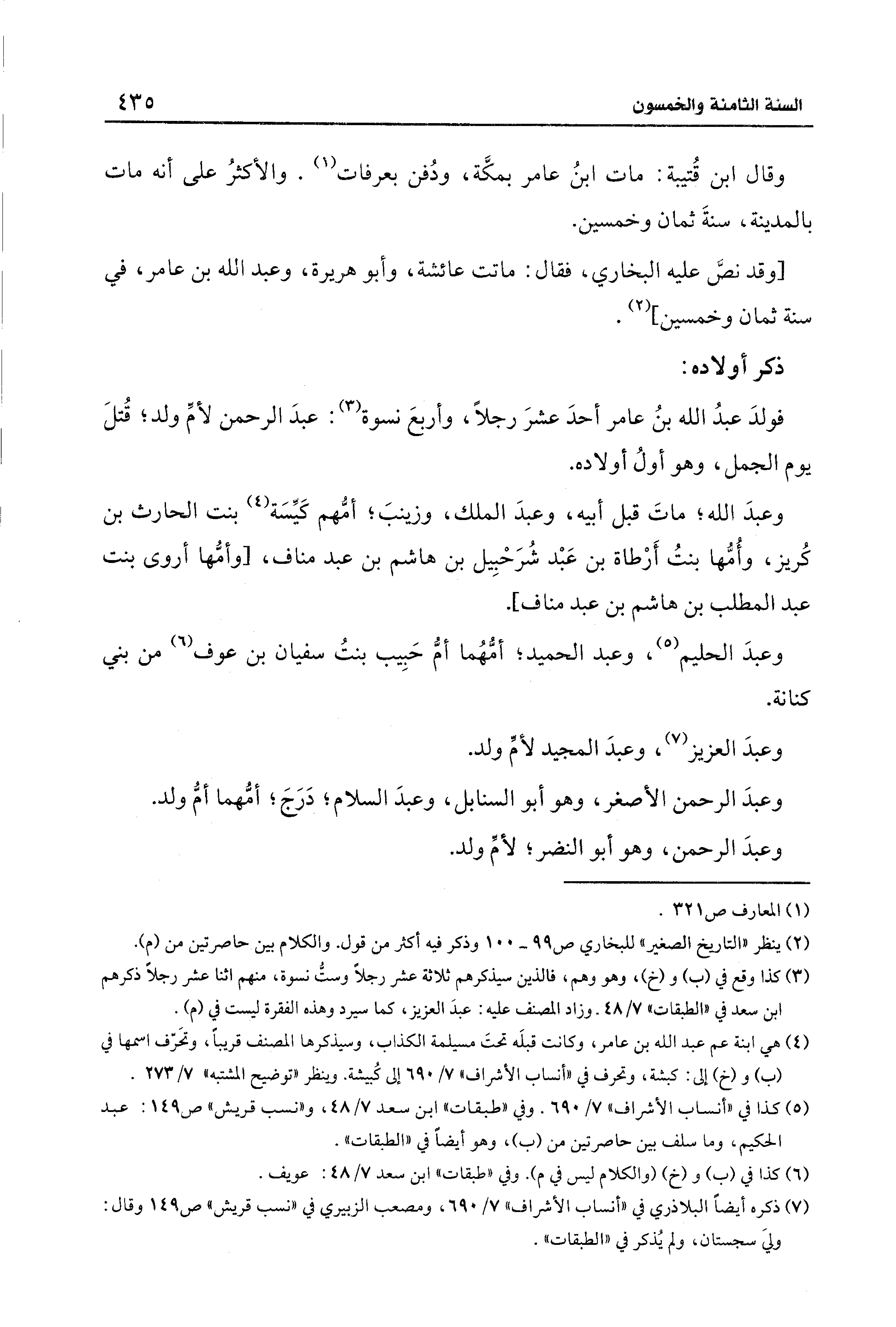 وقال ابن قُتيبة: مات ابنُ عامر بمكَّة، ودُفن بعرفات (¬1). والأكثرُ على أنه مات بالمدينة، سنةَ ثمان وخمسين.