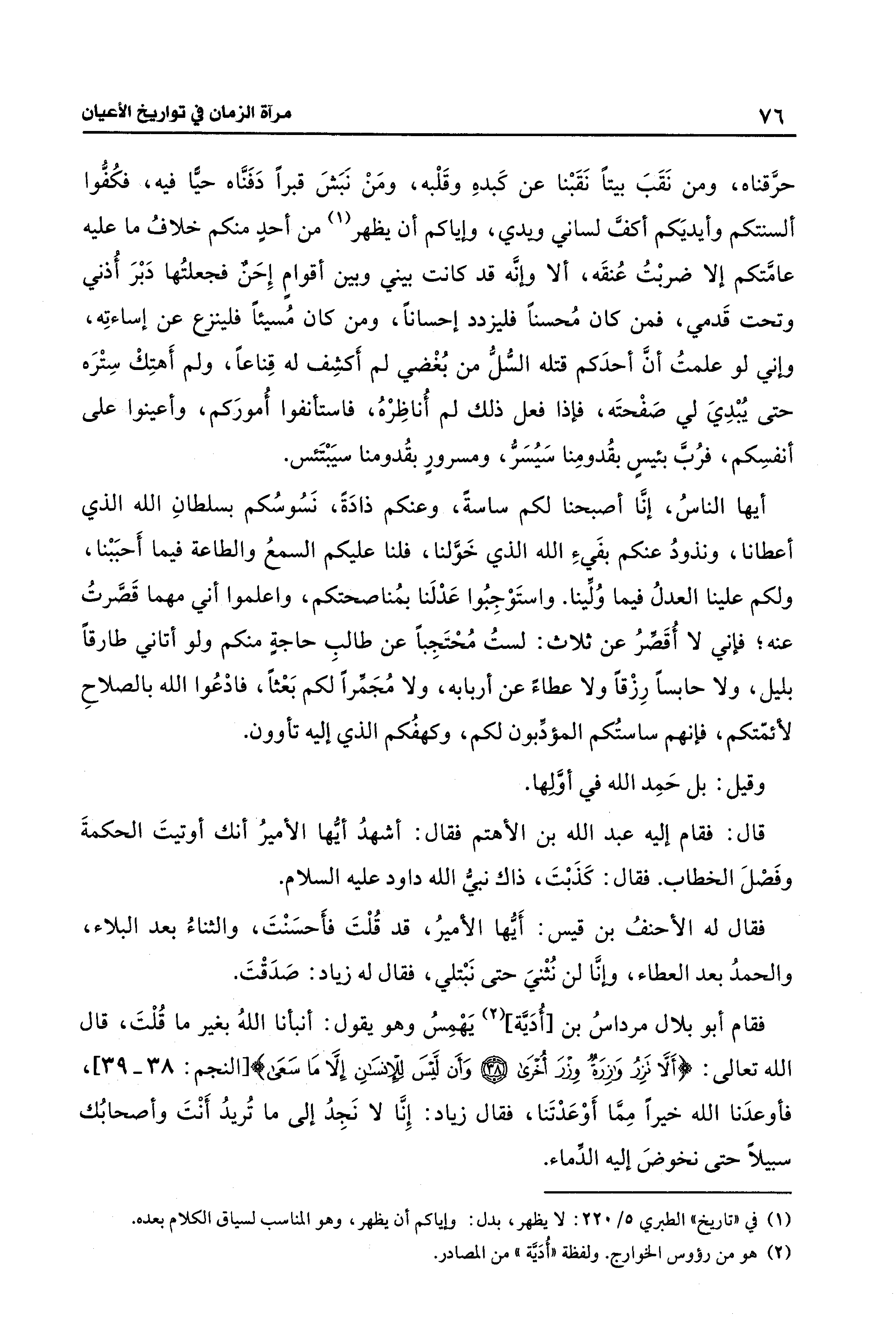 فقام أبو بلال مرداسُ بن [أُدَيَّة] (¬2) يَهْمِسُ وهو يقول: أنبأنا اللهُ بغير ما قُلْتَ، قال الله تعالى: {أَلَّا تَزِرُ وَازِرَةٌ وزْرَ أُخْرَى (38) وَأَنْ لَيسَ لِلْإِنْسَانِ إلا مَا سَعَى (39)} [النجم: 38، 39]، فأوعدَنا الله خيرًا مِمَّا أَوْعَدْتَنا، فقال زياد: إِنَّا لا نَجِدُ إلى ما تُريدُ أَنْتَ وأصحابُك سبيلًا حتى نخوضَ إليه الدِّماء.