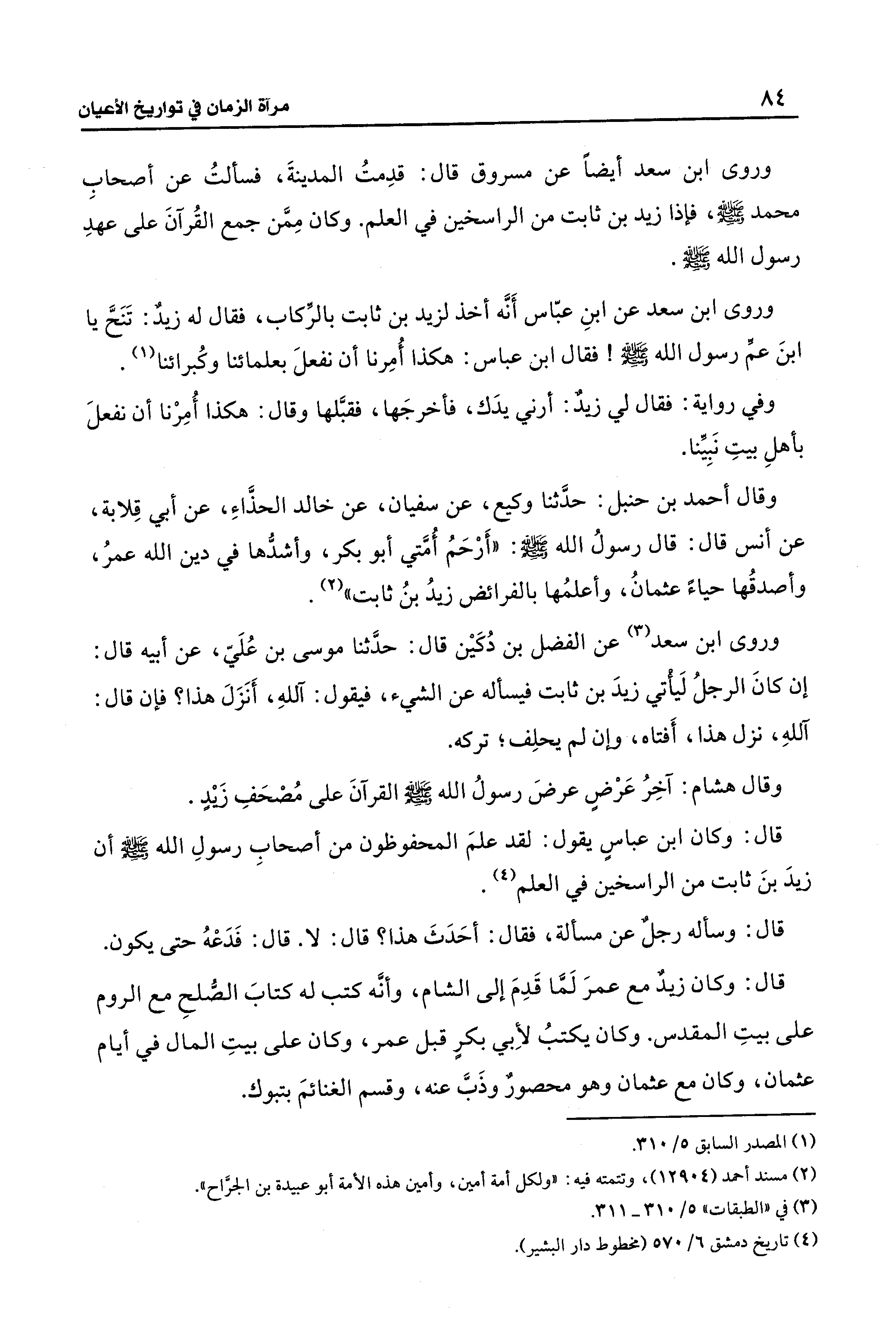 وروى ابن سعد أيضًا عن مسروق قال: قدِمتُ المدينةَ، فسألتُ عن أصحابِ محمد صلى الله عليه وسلم، فإذا زيد بن ثابت من الراسخين في العلم. وكان مِمَّن جمع القُرآنَ على عهدِ رسول الله - صلى الله عليه وسلم -.