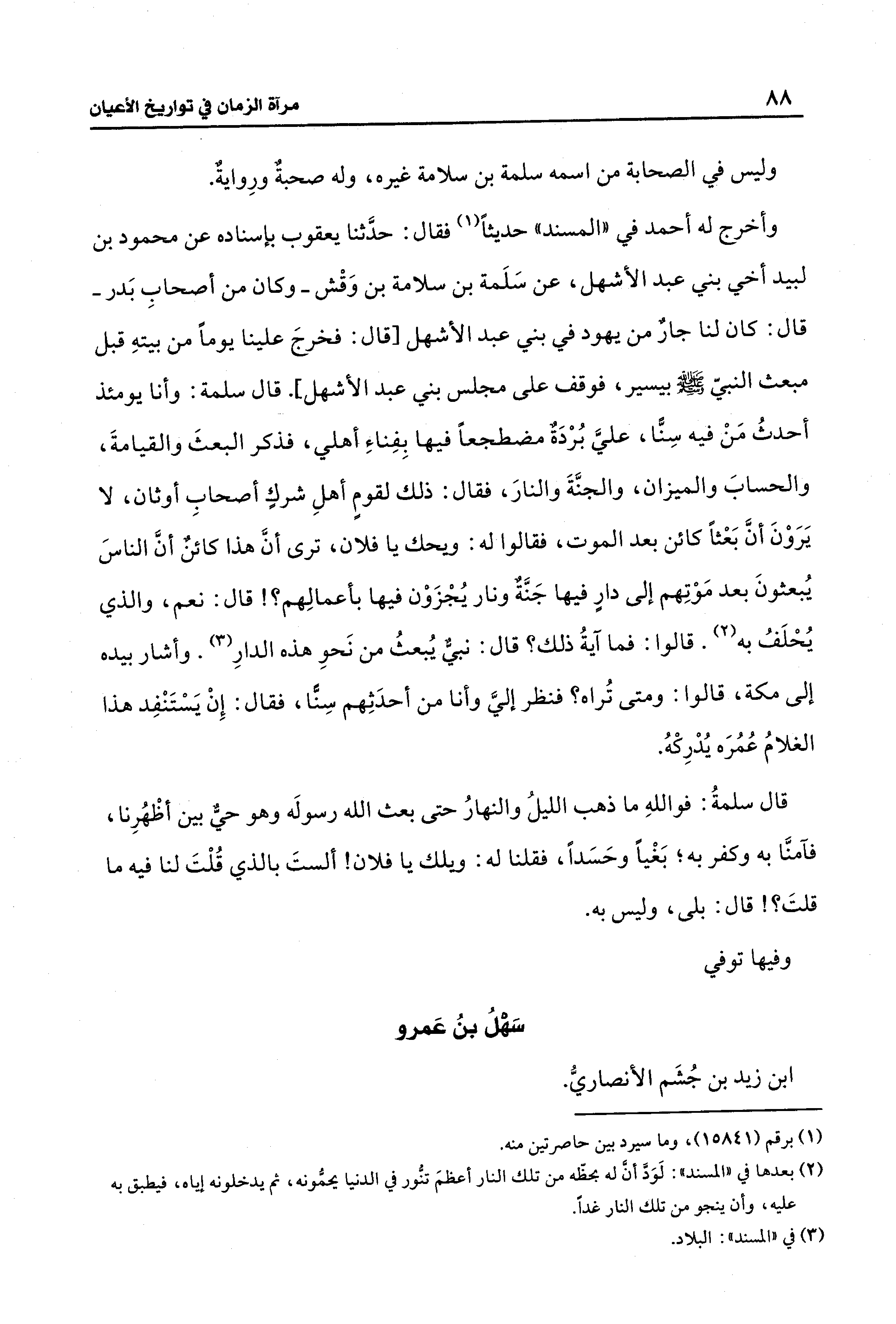 وأخرج له أحمد في "المسند" حديثًا (¬1) فقال: حدَّثنا يعقوب بإسناده عن محمود بن لبيد أخي بني عبد الأشهل، عن سَلَمة بن سلامة بن وَقْش -وكان من أصحابِ بَدر- قال: كان لنا جارٌ من يهود في بني عبد الأشهل [قال: فخرجَ علينا يومًا من بيتهِ قبل مبعث النبيّ - صلى الله عليه وسلم - بيسير، فوقف على مجلس بني عبد الأشهل]، قال سلمة: وأنا يومئذ أحدثُ مَنْ فيه سِنًّا، عليَّ بُرْدَد مضطجعًا فيها بِفِناءِ أهلي، فذكر البعثَ والقيامةَ، والحسابَ والميزان، والجنَّةَ والنارَ، فقال: ذلك لقومٍ أهلِ شركٍ أصحابِ أوثان، لا يَرَوْنَ أنَّ بَعْثًا كائن بعد الموت، فقالوا له: ويحك يا فلان، ترى أنَّ هذا كائن أنَّ الناسَ يُبعثونَ بعد مَوْتِهم إلى دارٍ فيها جَنَّةٌ ونار يُجْزَوْن فيها بأعمالِهم؟ ! قال: نعم، والذي يُحْلَفُ به (¬2). قالوا: فما آيةُ ذلك؟ قال: نبيٌّ يُبعثُ من نَحو هذه الدارِ (¬3). وأشار بيده إلى مكة، قالوا: ومتى تُراه؟ فنظر إليَّ وأنا من أحدَثِهم سِنًّا، فقال: إِنْ يَسْتَنْفِد هذا الغلامُ عُمُرَه يُدْرِكْهُ.